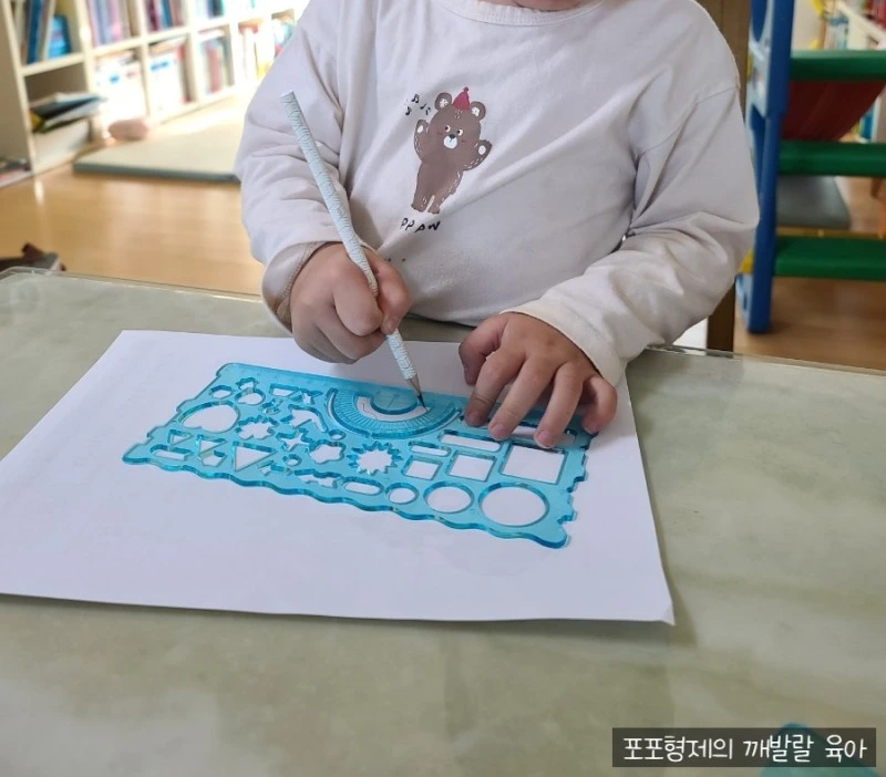 스케치북에 여러 가지 모양을 그려주고 모루로 모양을 만들어 보았다. 철사를 구부리는 게 생각보다 어려워 기본 도형에만 집중했었다. 아이스크림 막대에 찍찍이를 붙여 모양 만들기를 할 수도 있다. 이 때는 좀 확장해서 육각형, 오각형 등까지 표현해 주었다. 역시 다른 방향으로 놀이는 진행되었다. 기찻길을 만들기도 하고 젓가락놀이도 했다. 또 왕관이라며 머리에 쓰고 좋아하기도 했다. 모양자도 좋은 놀이템이 될 수 있다. 우리 초등학교 때는 많이 사용했지만 처음 접해 본 아이들은 참 재미있어했다. 여러 모양을 이용해 그림도 다양하게 그렸다.