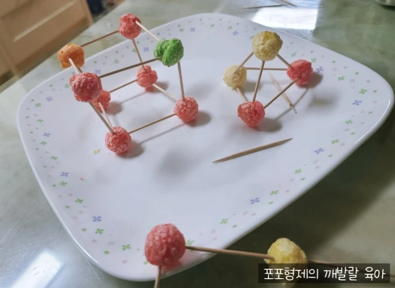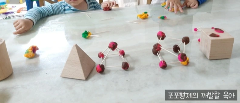 아무래도 입체도형은 아이들이 어려워할 수 있다. 나는 아이가 어렸을 때부터 꾸준히 수학동화를 읽어주었다. 책에서 어느 정도 내용을 접했기에 지금도 개념이나 용어를 어려워하지는 않는 것 같다. 책에서 익힌 개념을 이렇게 직접 해 보면 아이의 기억에 오래 남을 것이다. 먼저 집에 있던 나무블록을 이용해 사각기둥, 사각뿔, 삼각뿔 용어도 익히며 관찰해 보았다. 이쑤시개와 클레이로 같은 모양 만들기를 했다. 클레이뿐 아니라 뻥튀기를 이용해서도 만들 수 있다. 둘 다 아이들이 참 좋아한다. 이 때도 목표한 모양에 국한두기보다는 아이들이 자유롭게 만들 기회도 주었다. 첫째는 별자리를 만들 거라며 전갈자리를 만들었다. 뻥튀기할 때는 햄버거 괴물, 곤충 월드 등 다양한 놀이를 하면서 즐겁게 보냈었다.