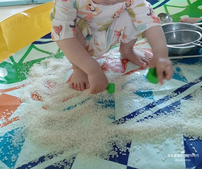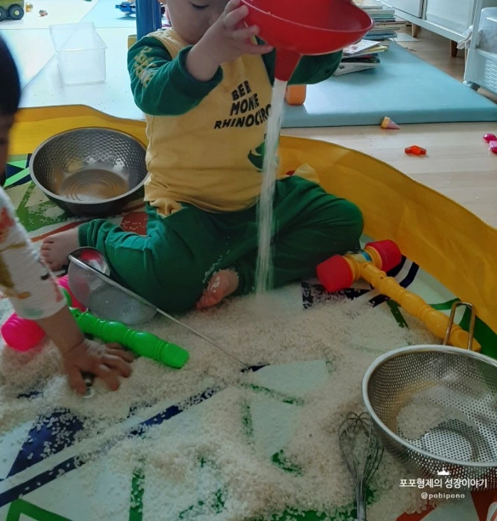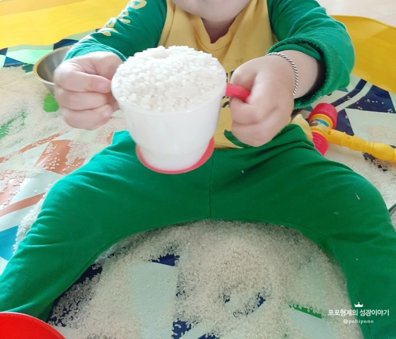 어느 집이나 쉽게 줄 수 있는 재료가 쌀이 아닐까? 또 아이가 논 다음 씻어서 먹으면 되니 낭비도 적다. 늘 오감놀이할 때 처음에는 재료만 주고 탐색하게 한다. 이것도 첫째 때 열심히 문화센터 다니면서 파악한 부분을 적용해 본 것들이다. 그리고 아이가 탐색이 끝났을 때쯤 주방 도구나 장난감을 하나씩 준다. 이 때도 한꺼번에 주지 않고 조금씩 추가해 주면 아이의 놀이 시간을 길게 할 수가 있다. 손으로 만지고, 도구에 담아서 옮기면서 아이는 다양한 영역의 발달이 이루어진다. 이때 가장 좋아했던 놀이는 가장 오른쪽 사진에 있는 장면이었다.
