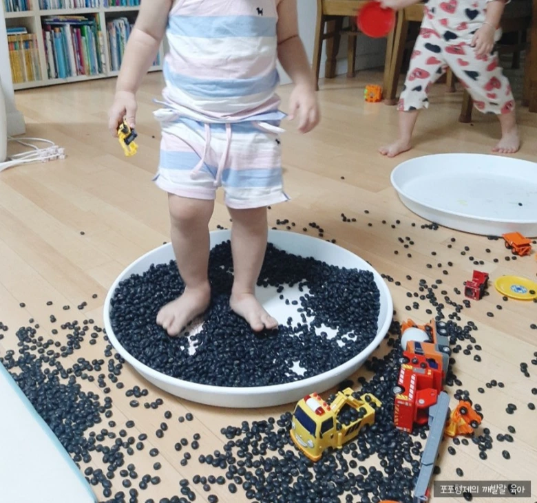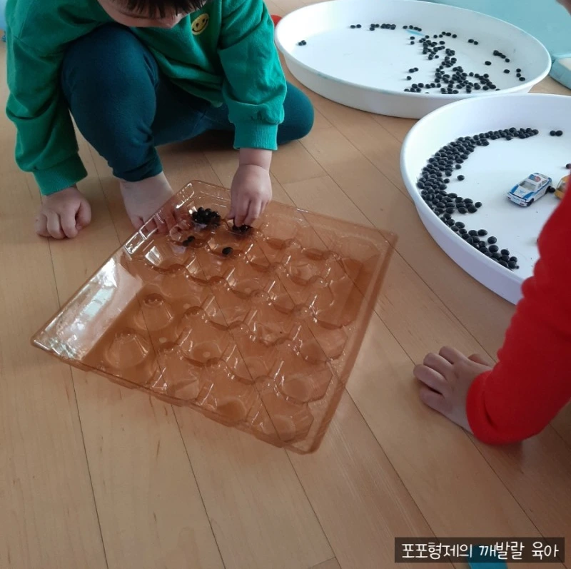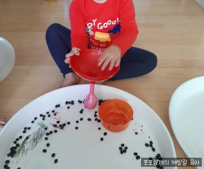 이번에는 검은콩으로 놀이를 했었다. 이때 둘째가 트레이 안에 들어가서 발로 막 차는 바람에 악 소리가 날 정도로 치웠었다. 그때는 한숨이 나왔지만 이런 것들도 지금은 소중한 추억이 되어 있다. 검은콩은 조금 크기 때문에 아이와 수세기 놀이 하기도 좋다. 계란판을 이용해서 홀수, 짝수를 해도 되고 숫자 크기대로 놓으면 바로 이게 수학놀이가 된다. 주방도구는 늘 좋아한다. 국자, 체 등 다양하게 주면 아이들은 그 자체로도 즐거운 시간을 보낸다. 여기에 장난감 자동차도 주면 담고 옮기며 한참을 놀이에 빠져든다. 검은콩을 풍선에 넣으면 우리만의 악기도 만들 수 있다.