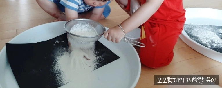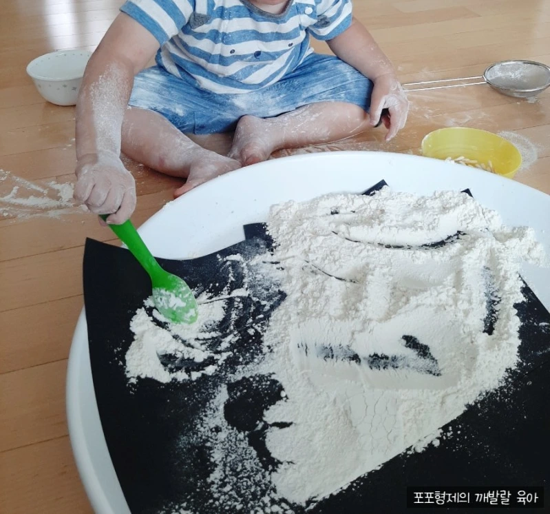 우리의 첫 오감놀이였던 밀가루였다. 밀가루도 처음 주었을 때는 잘 놀지 않았다. 그러다가 다음에 접하고 도구도 주니 잘 놀았던 기억이 있다. 아이도 처음에는 낯설지만 몇 번 접하면 확실히 더 잘 노는 것 같다. 다른 놀이와 마찬가지로 주방도구와 장난감 자동차와 놀이한 뒤 밀가루 엑스레이를 해 보았다. 검은 종이 위에 손을 올리고 체로 밀가루를 치면 손 모양만 남는다. 그리고 면봉으로 뼈를 표현해 주면 된다. 기회가 되면 물이나 색소를 추가해 아이가 반죽을 해도 재미있을 것 같다.