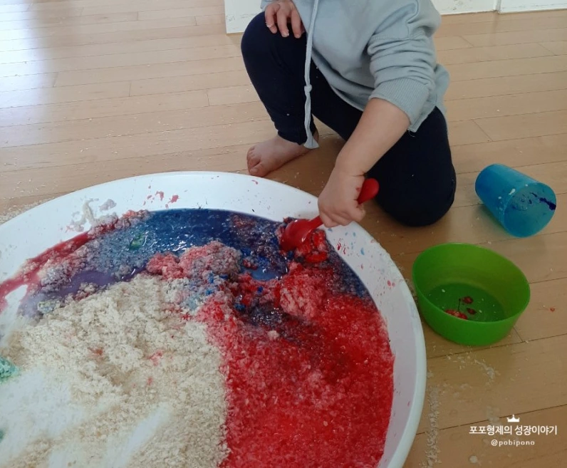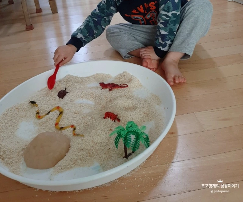 음식 재료를 사면 유통기한이 지난 걸 발견할 때도 있다. 그럴 때는 아이의 놀이 활용하고 버렸다. 빵가루도 그렇게 활용한 경우다. 역시 재료를 탐색하고 이 때는 곤충, 파충류 피겨를 주어 사막놀이로 확장했다. 여러 번 놀이를 한 결과 물이 있으면 더 즐거운 걸 알아서 물도 주고 색소도 추가해 주었다. 날씨가 춥거나 비가 오면 오늘은 뭐 하지 걱정이 될 때가 있다. 그럴 때 이런 놀이 하나만 생각해 놓으면 아이와의 오후가 편안해진다.