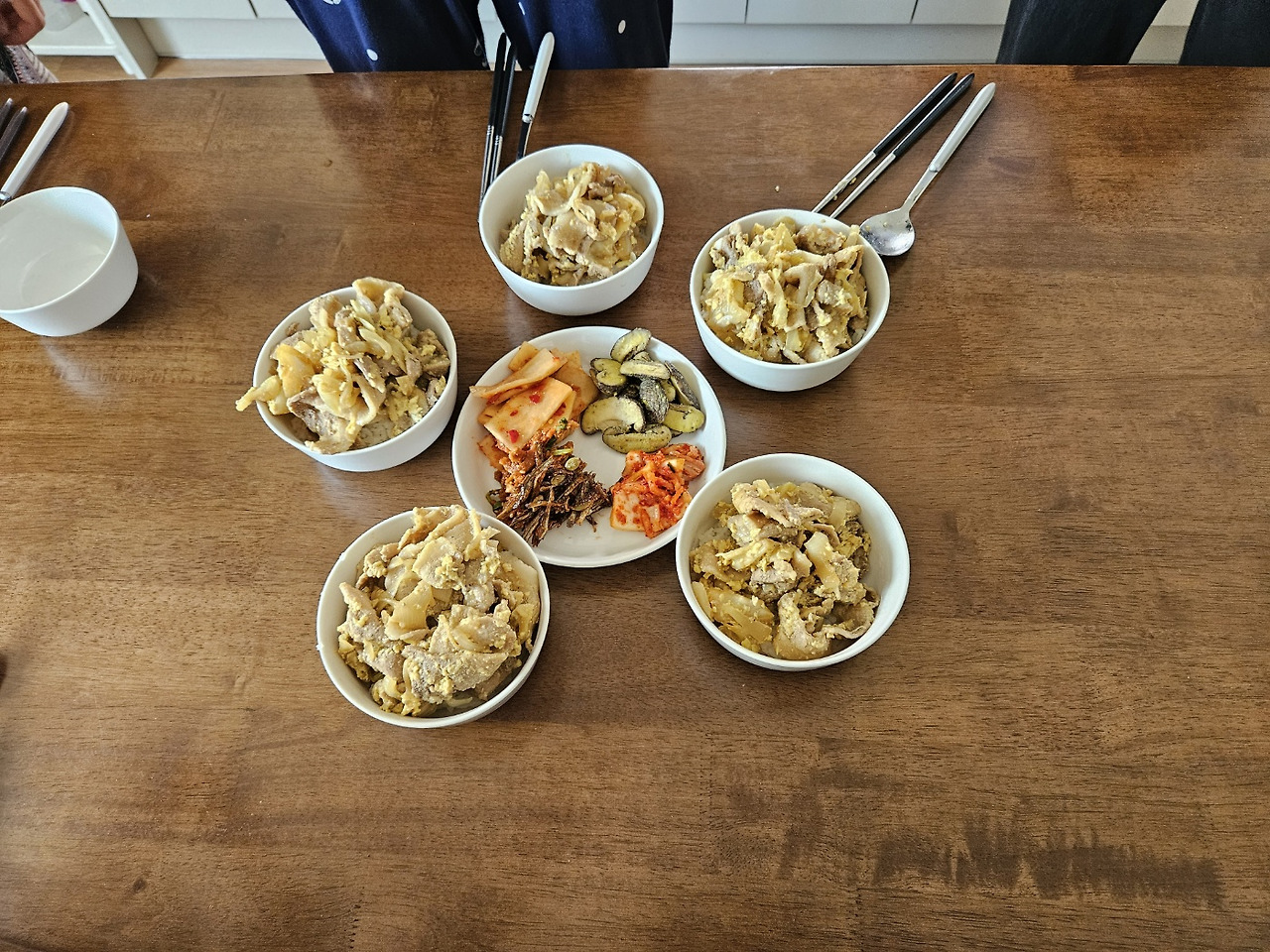가져온 밑반찬과 규동을 맛있게 먹는다.