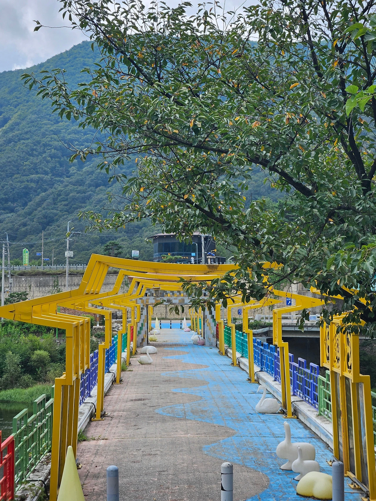 전남교반. 인공적으로 만들어진 다리 위에는 한옥 지붕 모양의 철제물이 줄지어 서 있다. 야경이 특히 아름답다는 다리를 보기 위해 밤에도 한번 더 만나고 싶다.