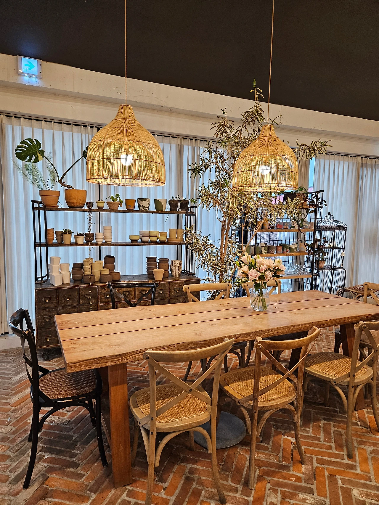 카페라밀은 커피를 좋아하는 부인, 인테리어를 하는 남편, 그리고 식물 가꾸기를 좋아하는 어머니의 애정이 더해진 카페로, 개인 카페이지만 체인점까지 생길 정도로 많은 카페다. 들어서자마자 푸른 식물의 싱그러움과 라탄으로 만들어진 인테리어 용품들을 보니, 이국적인 분위기가 물씬 풍긴다.