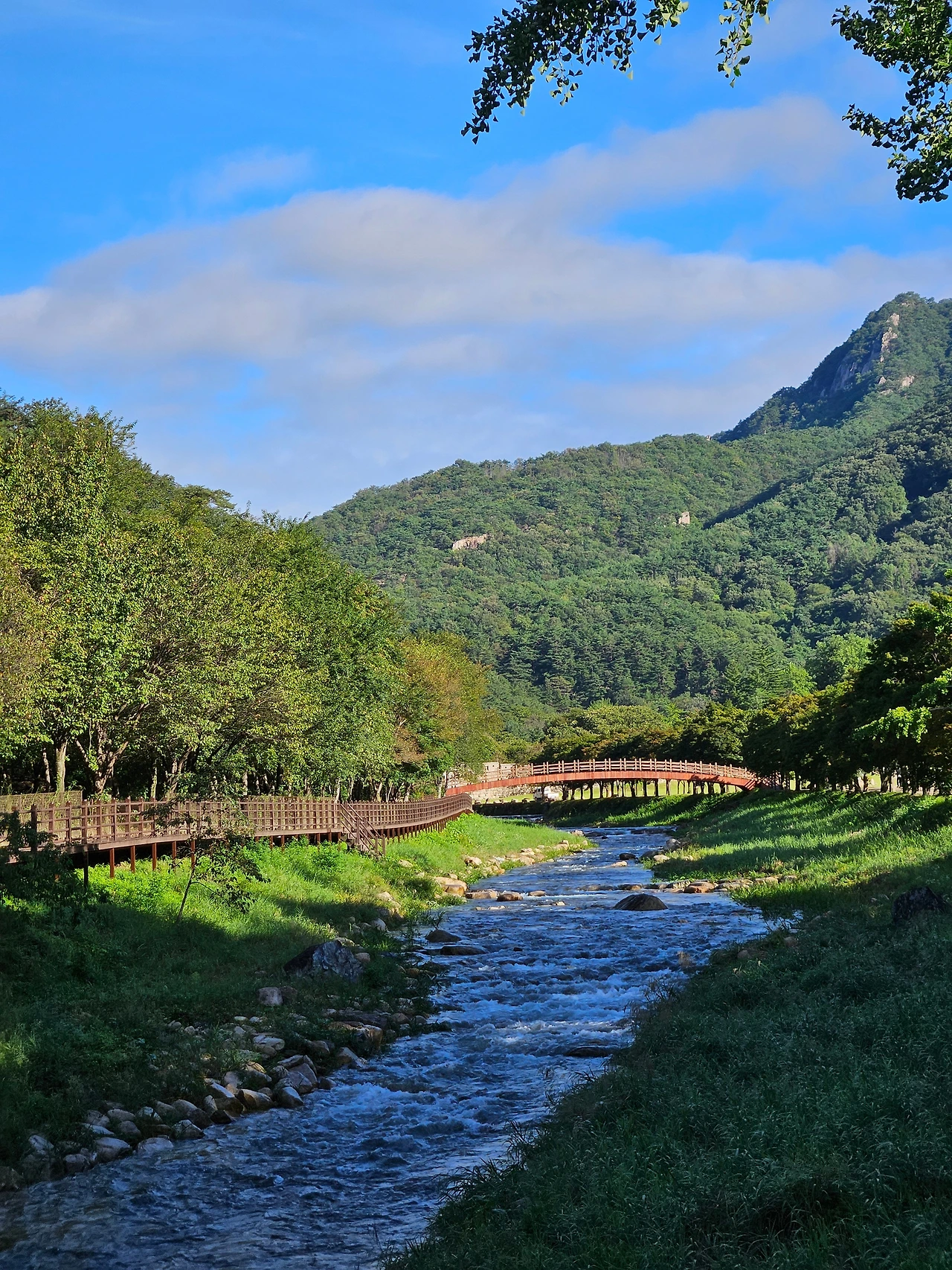 백두대간. 높은 산자락이 끊임없이 이어져 푸르름을 만들고, 오랜만에 맑게 갠 하늘이 장관을 만든다. 오늘 함께하는 가이드 도봉 님의 이야기에 의하면 학창 시절, 제1 관문 앞 공원에는 나무들이 산재해 있어 소풍으로 자주 왔었다고.
