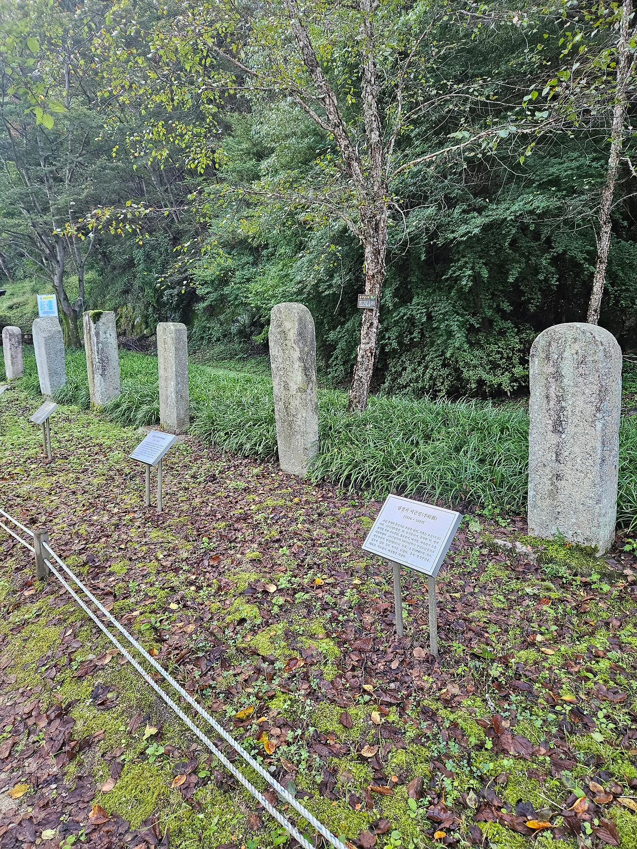 옆으로는 물이 흐르고 다른 길에는 관찰사 기념비가 줄지어 서 있다.