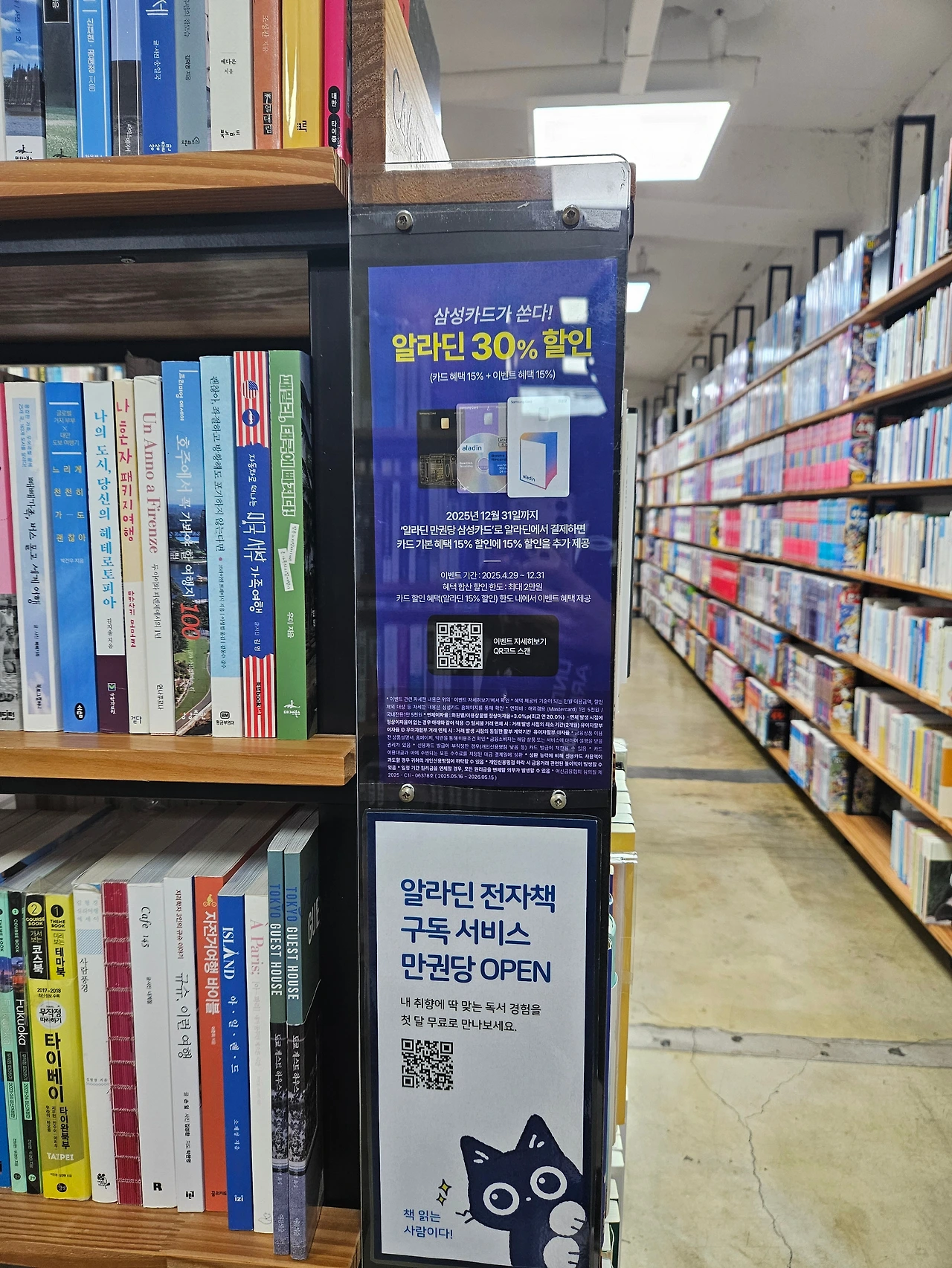 삼성카드와 알라딘의 콜라보 프로모션. 기존 15% 할인받고 15% 추가 할인이 올해 말까지 이어진다.