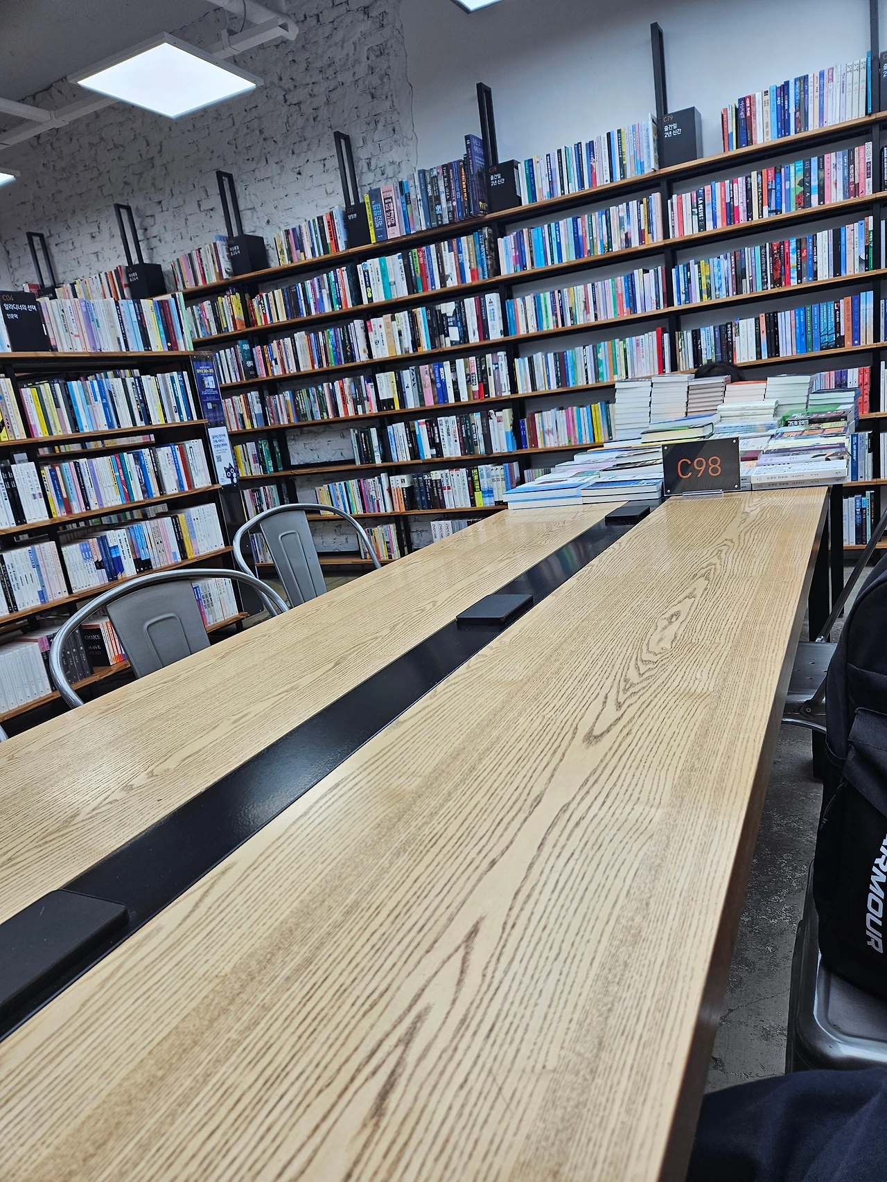 코로나 시절을 지나 좌석이 축소된 서점의 테이블은 하나로 줄어 있었고, 좌석이 6자리 준비되어 있다.