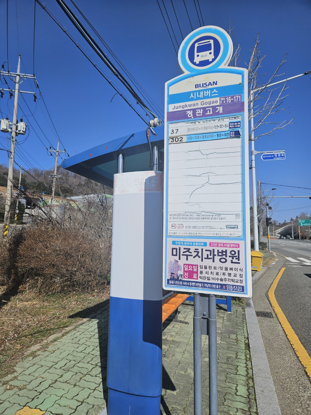 버스정류장 정관고개역에 내려서 보행신호버튼을 누르고 기다리면 신호가 바뀌어서 횡단보도를 건널 수 있다.