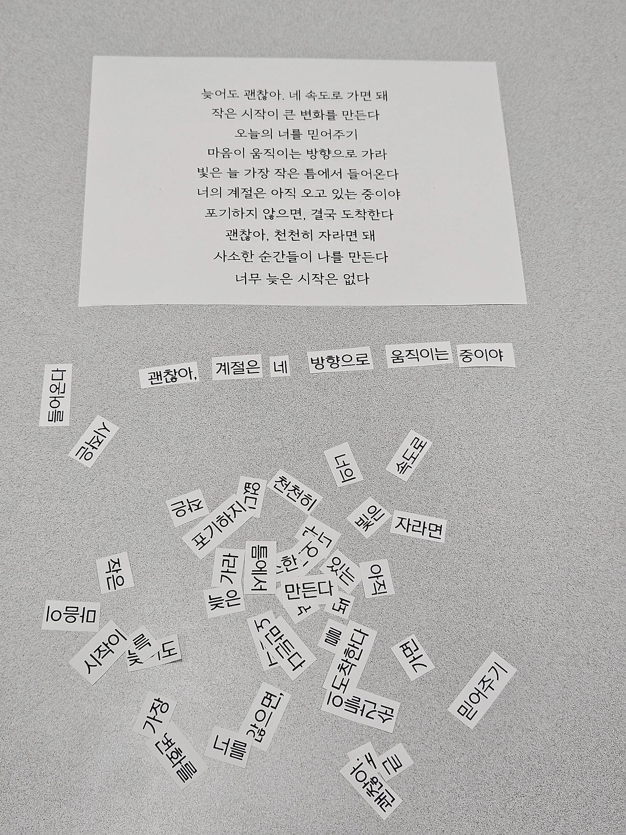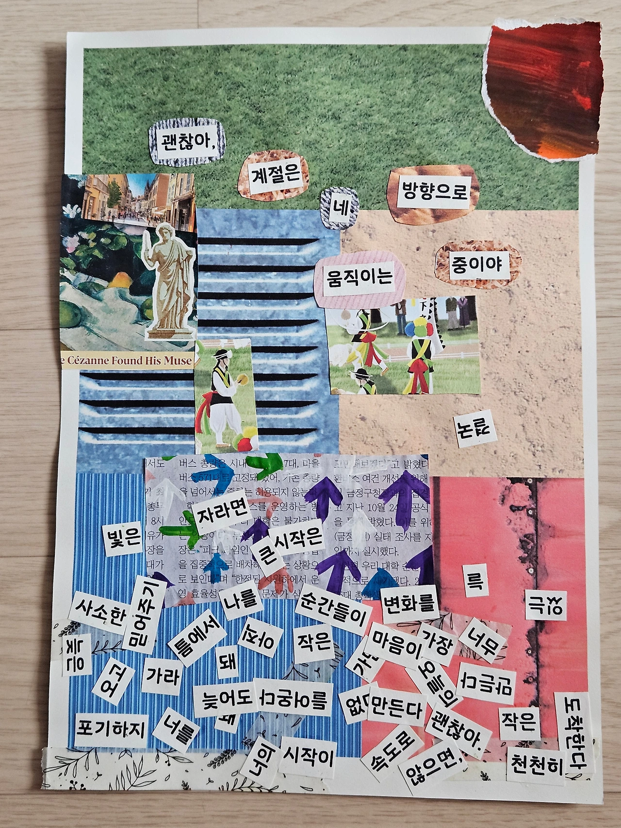작가님이 준비해 주신 좋은 문구들 중에서 마음에 드는 문장을 골라 콜라주로 표현해도 좋고, 자신이 쓴 시를 빗대어 나타내도 좋다.