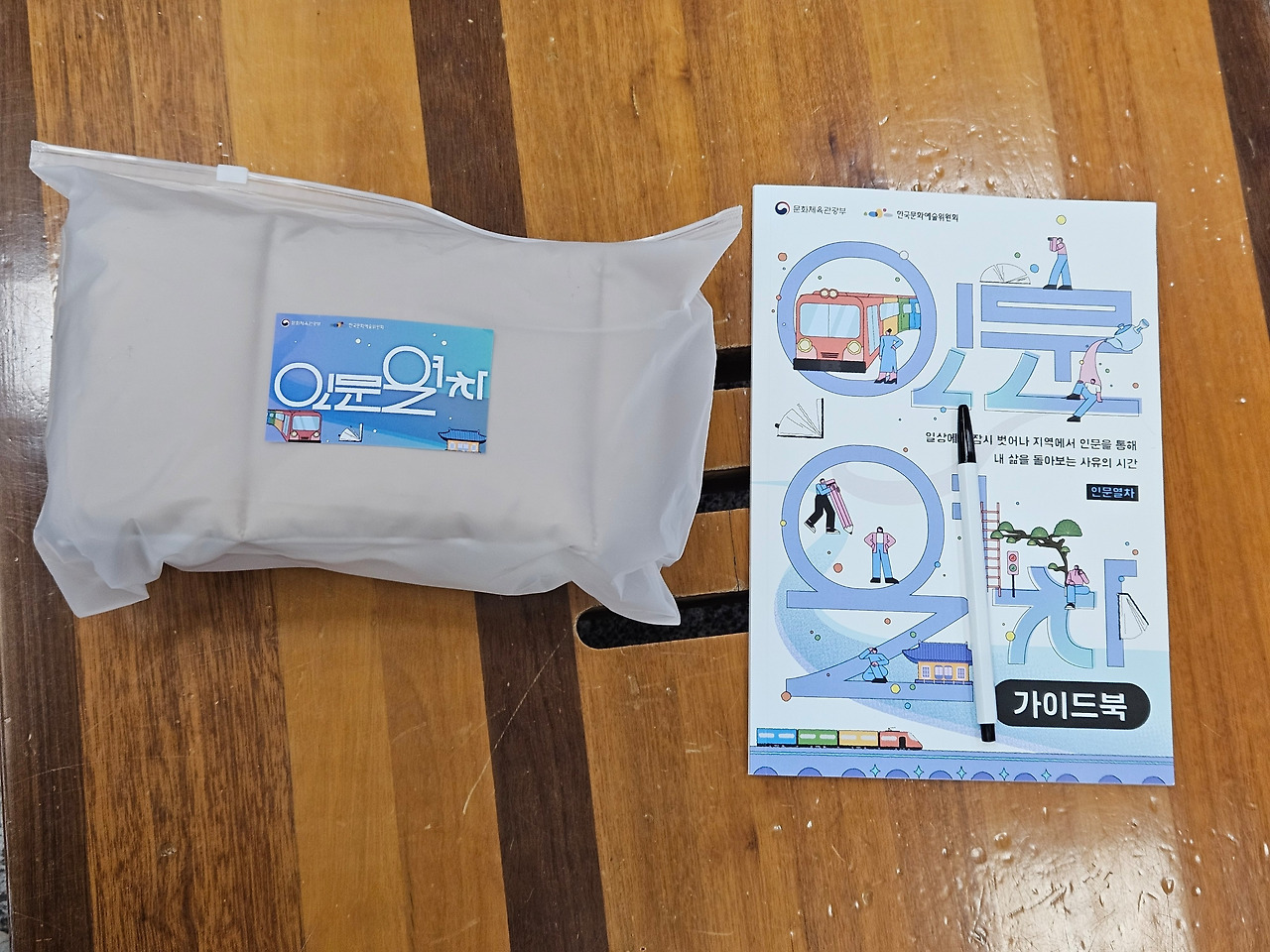 인문열차를 기다리는 일행들이 얌전히 사람들을 기다린다. 만나자마자 우리에게 주어지는 선물이 꼭 마음에 든다. 베이지색 패딩 목도리와 여행에 꼭 필요한 가이드북. 간단하지만 꼭 필요한 물품이다.