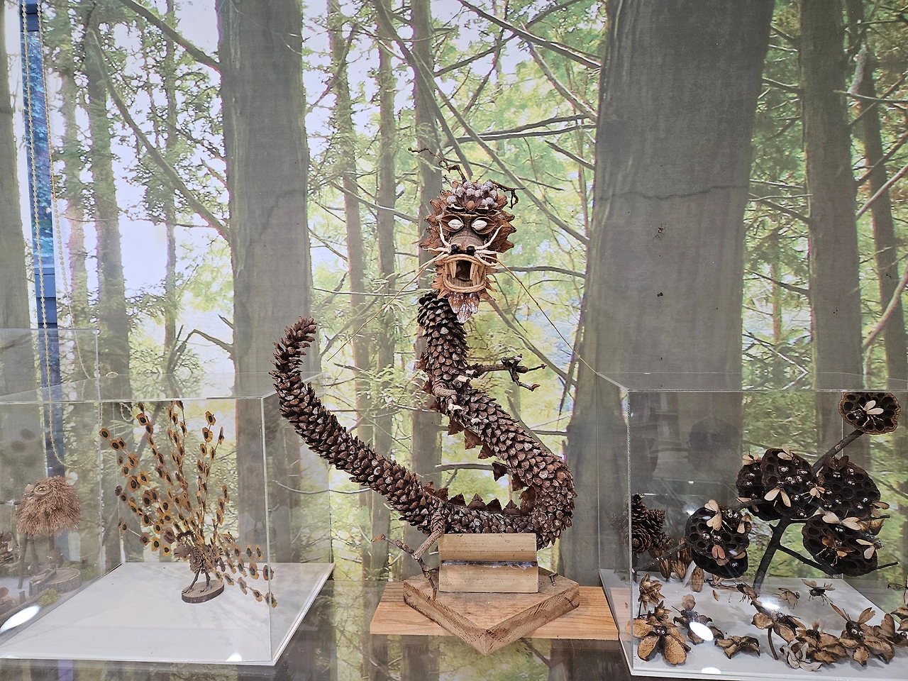 용 모양의 목공예품이 시선을 사로잡는다. 꽤나 무서운 외형이지만 짧은 다리가 귀엽다. 비늘을 솔방울의 잎사귀로 만든 센스는 최고.