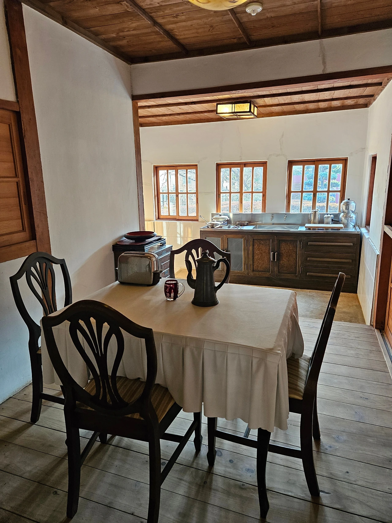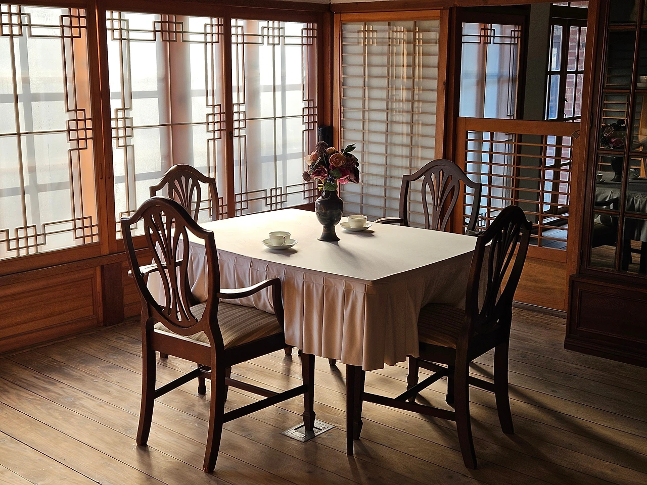 식탁과 의자만 보면 유럽의 옛 모습 같지만, 그 주위를 둘러싼 모든 것들은 지극히 한국스럽다.