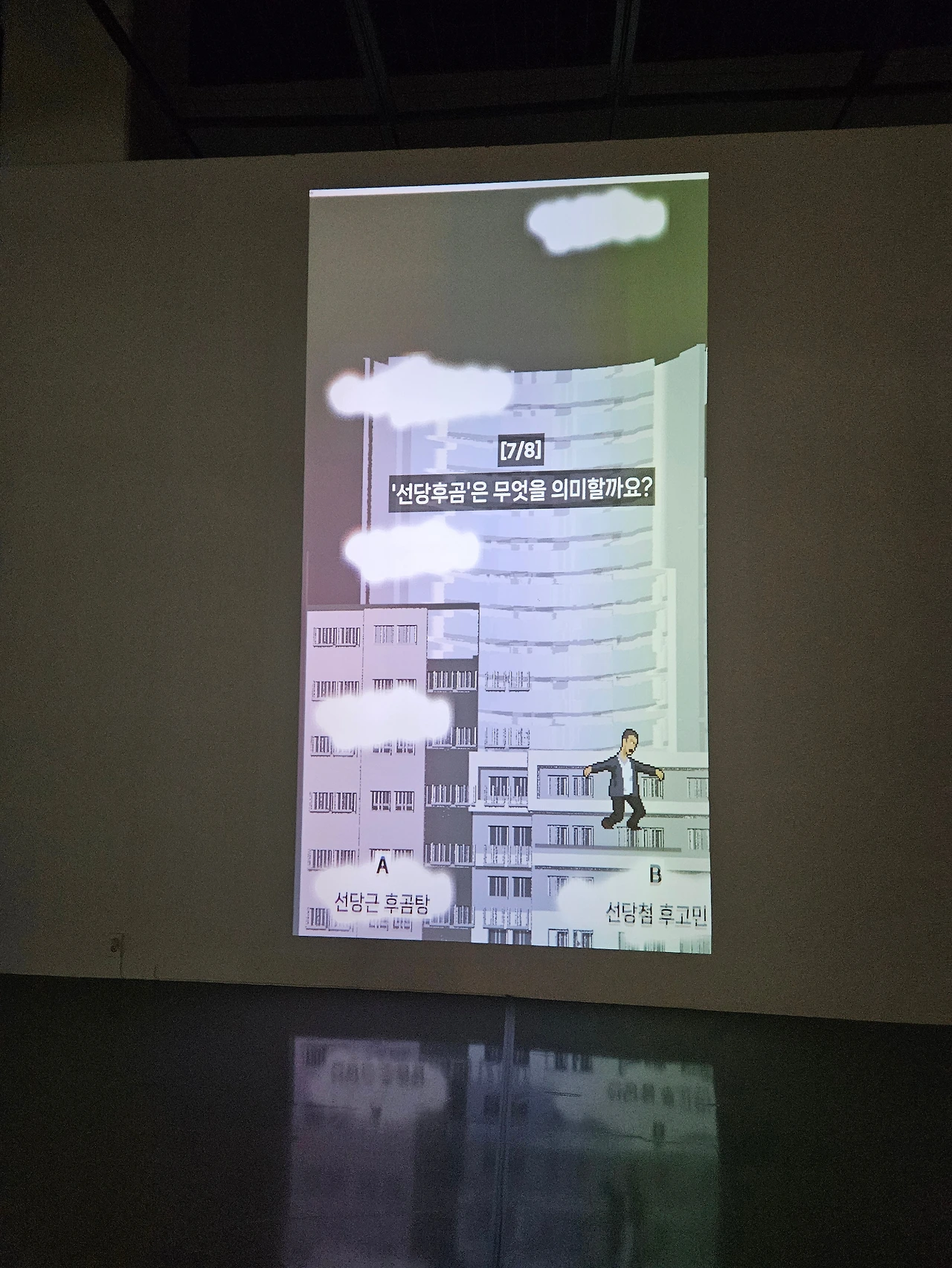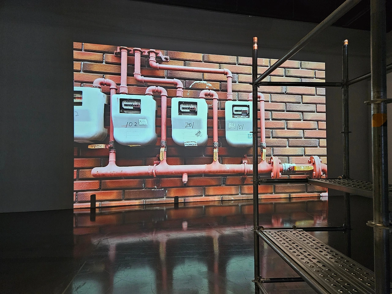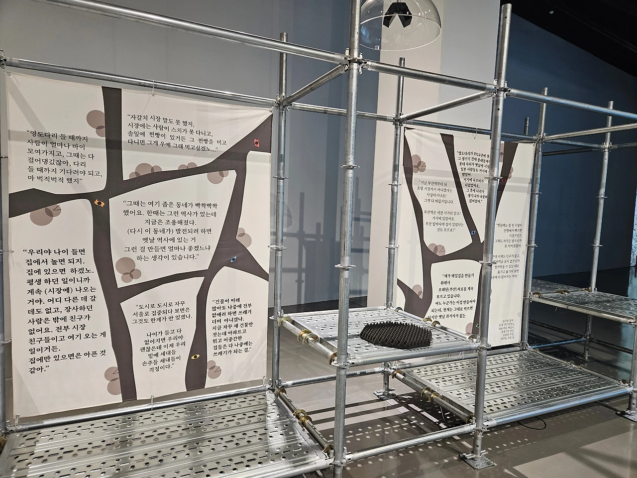 비계로 이어진 공간을 걸을 때마다 층간소음이 지대하다. 부산의 특색이 담긴 영상이 곳곳에 상영 중이다.