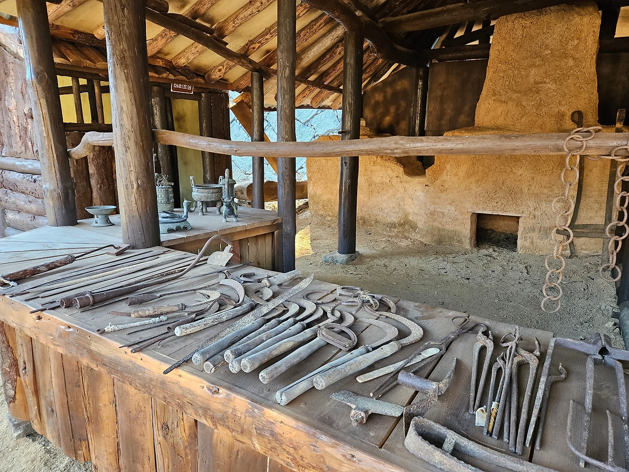 지금도 농사일할 때 쓰이는 낫과 도끼, 호미와 어디에 쓰이는지 궁금증을 유발하는 인두까지 야무지게 놓여있다.
