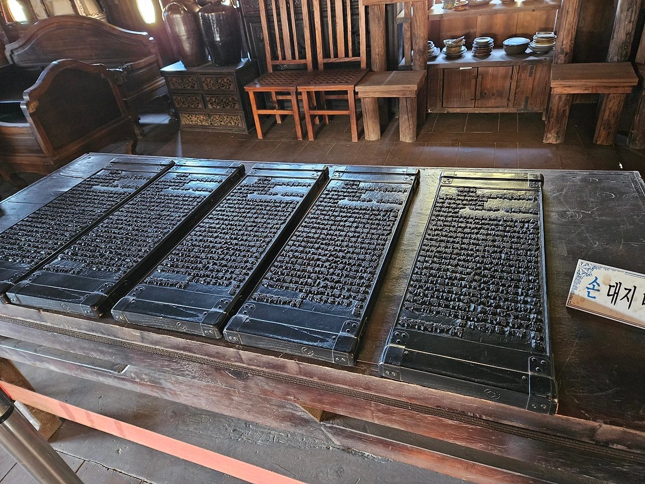 실제 팔만대장경 목판은 평화와 안위를 바랐던 사람들의 염원이 한 땀 한 땀 깎아 만들었다면, 지금 여기 있는 목판은 틀에 찍은 복사품.