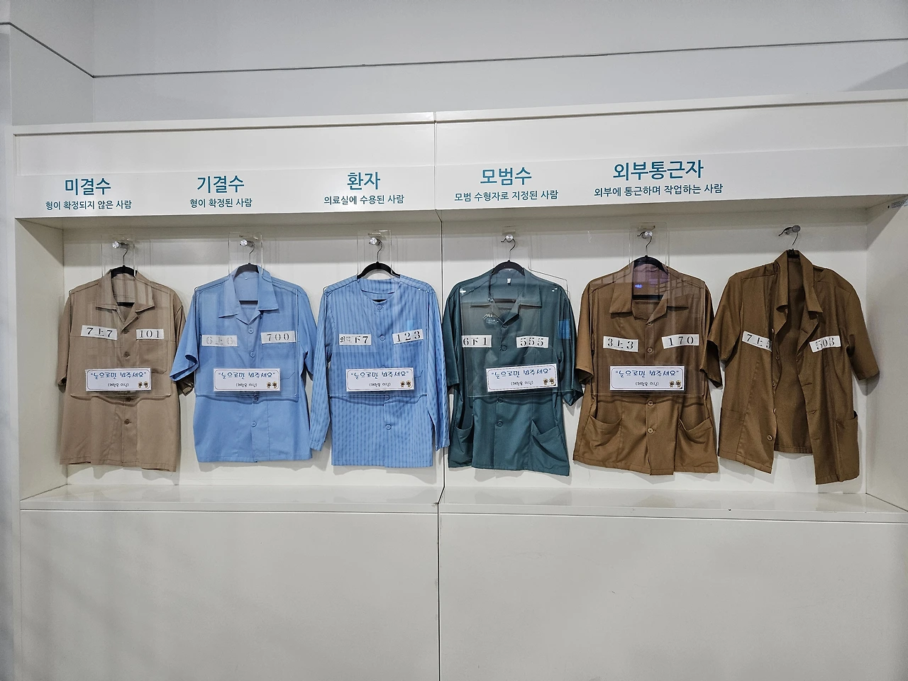 이름을 잃고 번호가 주어지며, 미결수부터 판결 후 기결수, 환자, 모범수와 외부통근자의 신분이 의복으로 결정된다.