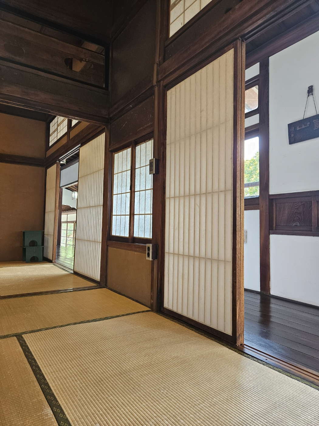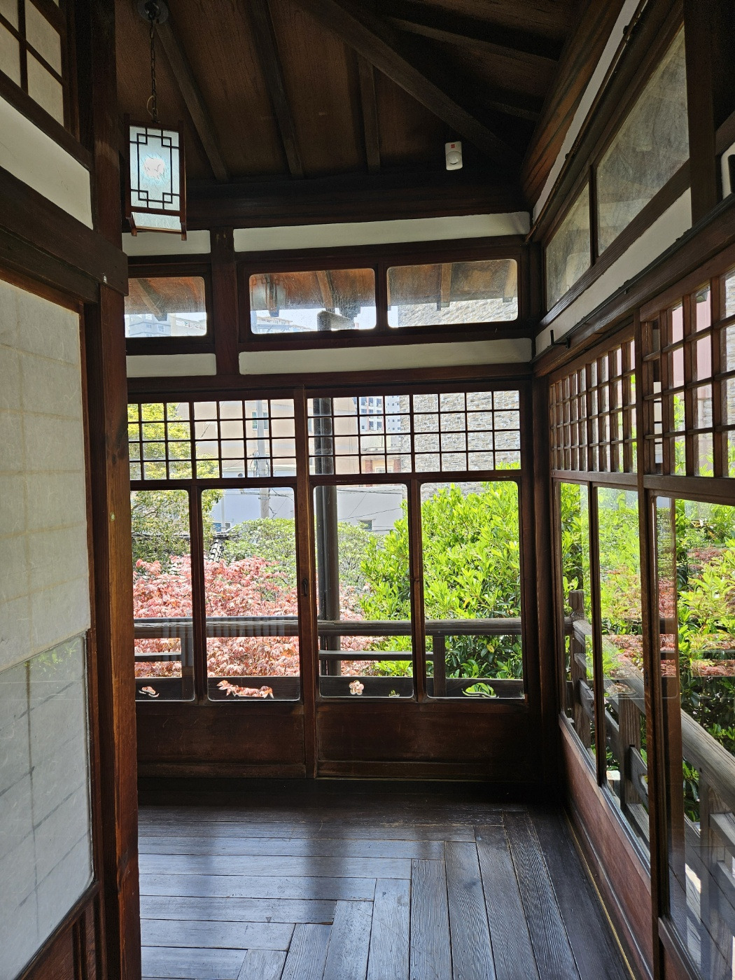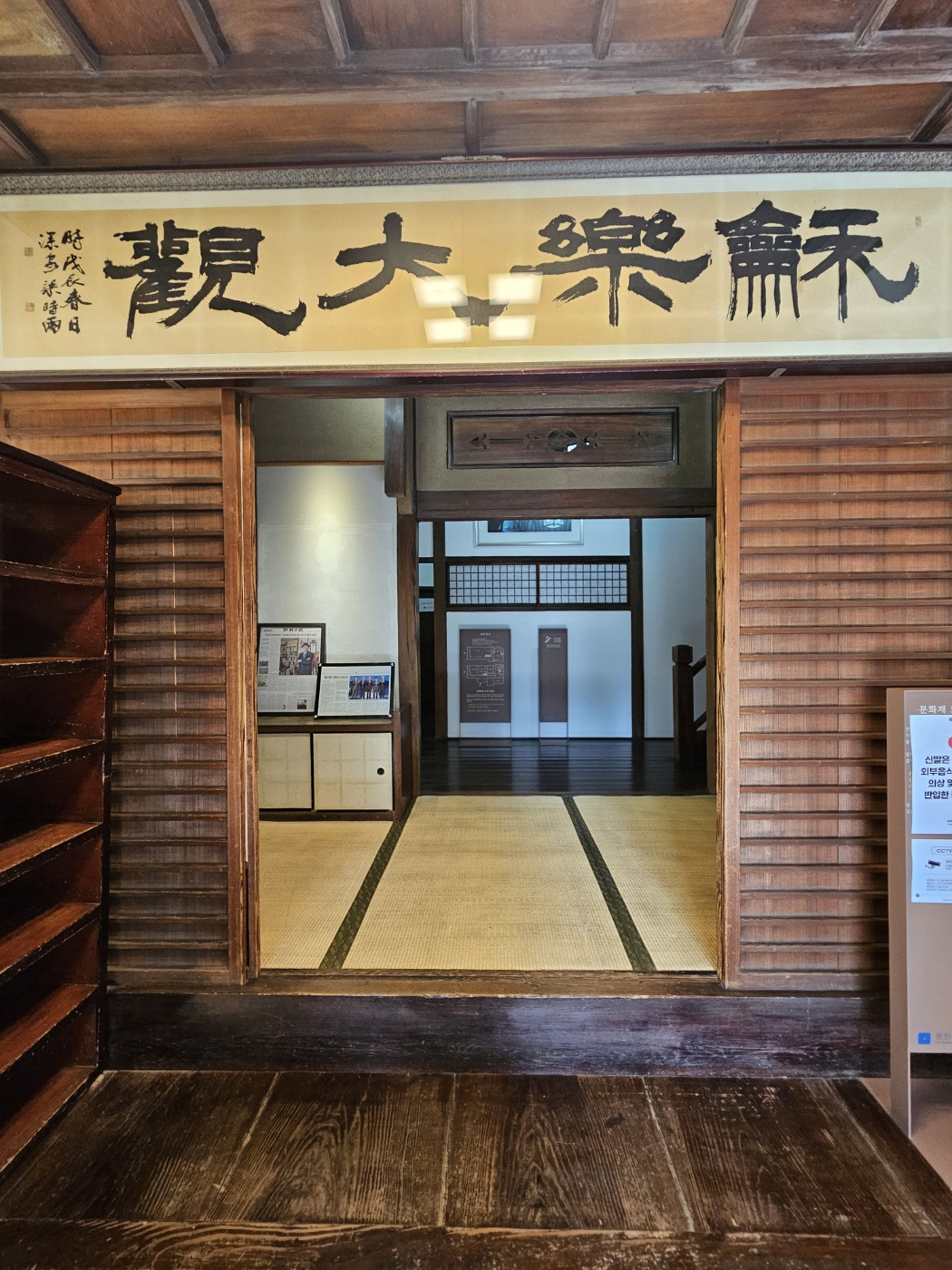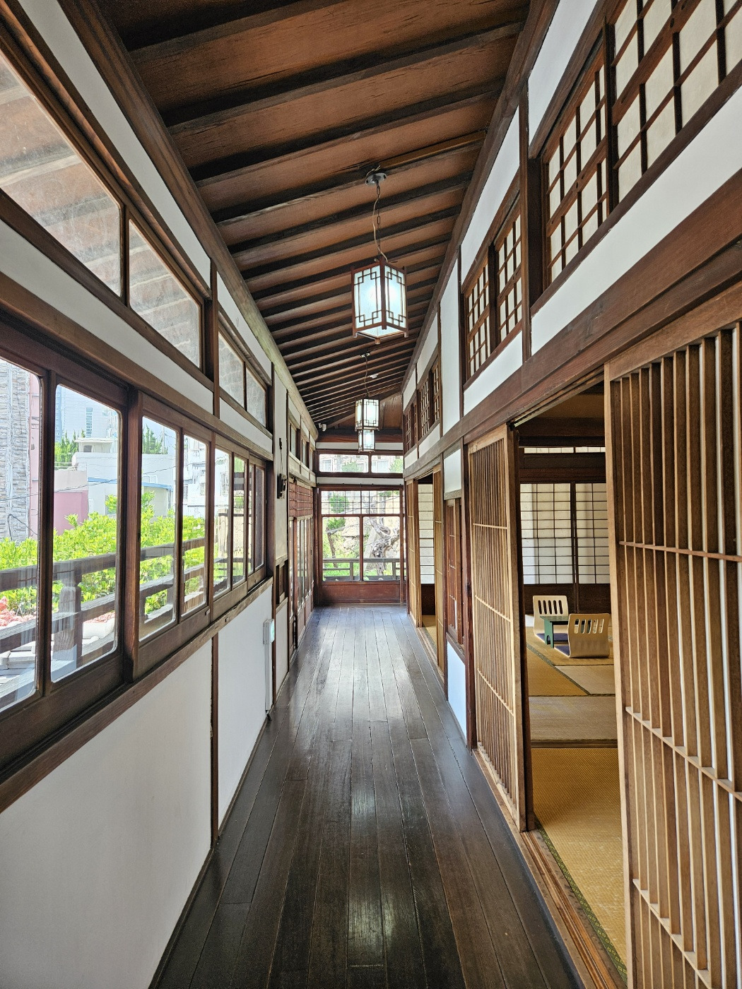 유리창으로 바깥의 풍경이 마치 그림액자처럼 보이는 복도를 돌면 벽이 아닌 미닫이 창으로 가려진 방을 볼 수 있다.