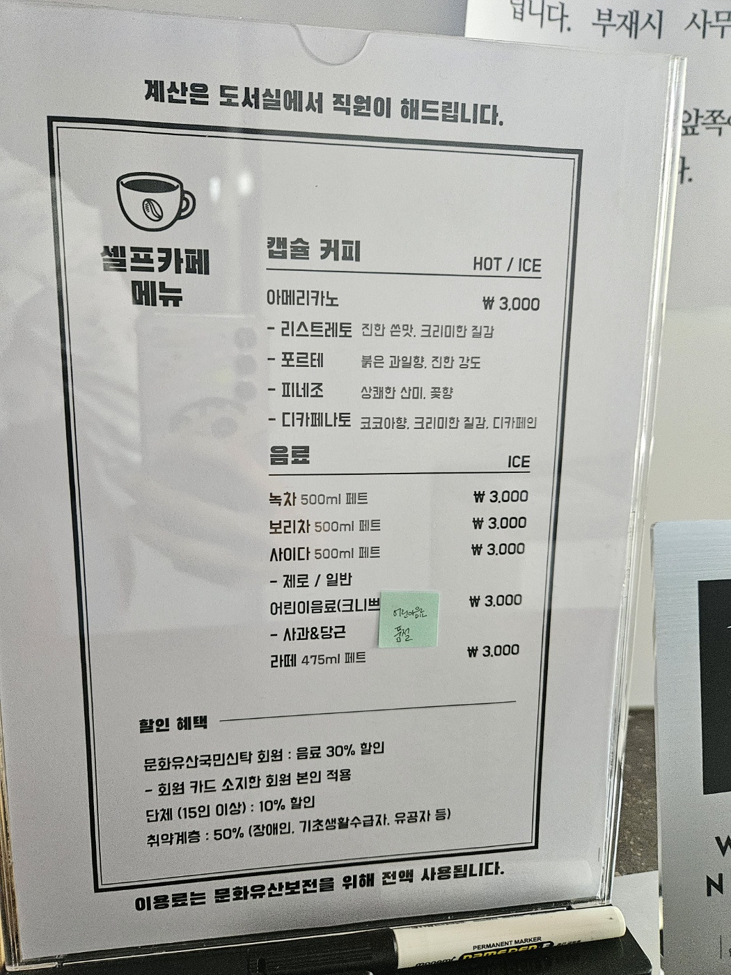 도서실 바로 옆에 셀프카페가 있는데, 도서실에서 3천 원을 결제하고 자유롭게 이용이 가능하다.
