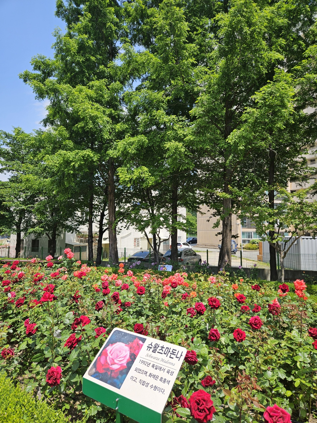 시끄러운 도로가를 마주하고 있고, 아파트 단지 사이의 작은 화단에서 피어나 활짝 피어있는 장미를 보니 불현듯 장미공원이 생각났다.