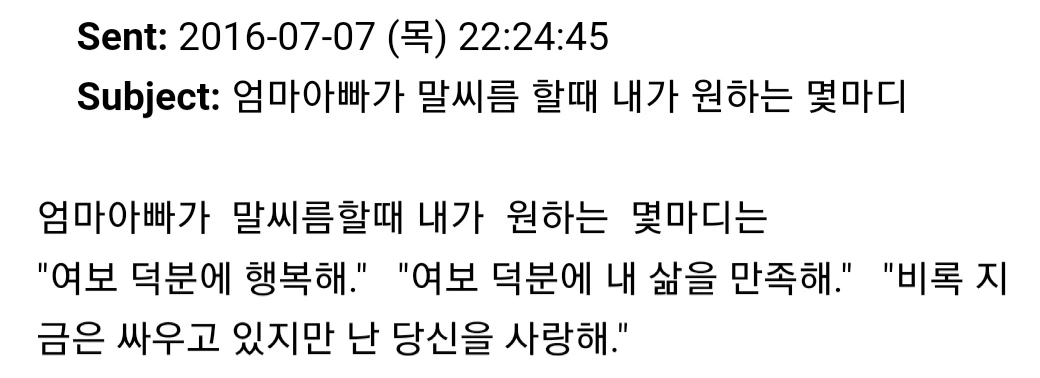 "싹이 보일라고 하면 애초에 개지랄을 떨어서라도 정신 번쩍 차리게 해 줄 거야!! 그니까 걱정 마! 그리고 지금까지의 여보는 안 그래. 지금의 여보는 참 좋은 사람이야... 그런데 말이야... 생각해보니 이런 걱정은 참 좋은 걱정 같지 않아? 혹시나 닮을까, 혹시나 은연중에 나오는 건 아닐까 생각하면서 자꾸 돌아보게 만들잖아. 우리 이런 걱정은 하면서 살자~~ 여보도 알다시피 나도 닮고 싶지 않은 사람이 있거든~~ 그러니까 우리 정말 정신 번쩍 차리고 살자."