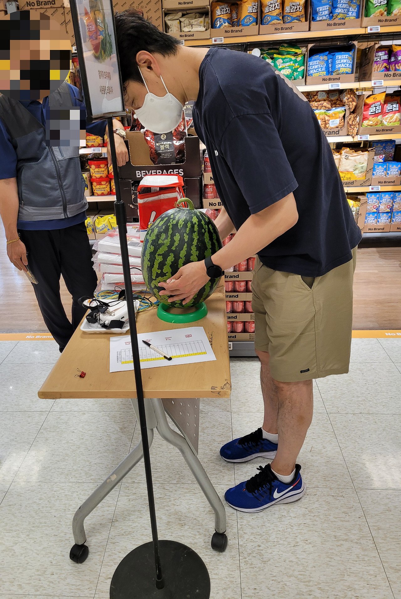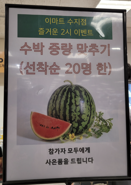 "오후 2시부터 수박 중량 맞추기 행사를 2층 노브랜드 매장 앞에서 진행하오니~~~ 맞추는 분께는 수박을~~~"