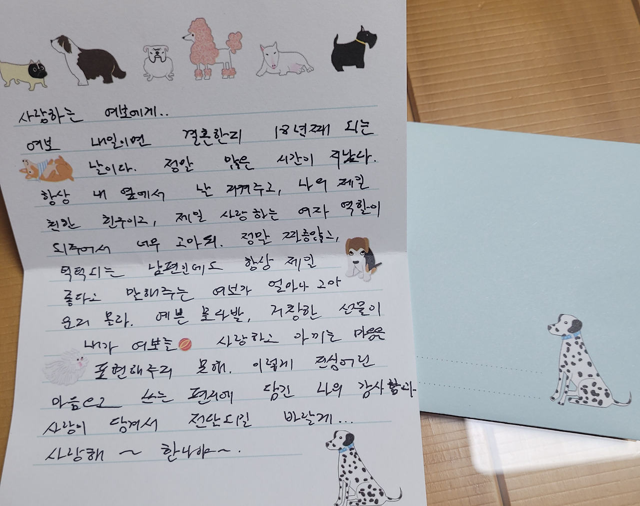 "여보~~~ 3초보다 더 행복해지는 방법을 알려줄게. 물구나무가 아닌 다른 이벤트를 고민해 봐~~ 나에게 5초 행복해주겠다는 마음으로 이벤트를 준비하면 20초 행복해질 거야. 그리고 내가 어디서 봤는데~~~ 부부관계는 상호적이어야 되는 거래~ 서로의 마음속에 있는 사랑 주머니를 채워주기 위해 함께 노력해야 행복해진다는 거야~ 나 7장 썼으니까! 오빠도 한 장 제대로 써 와~~~"