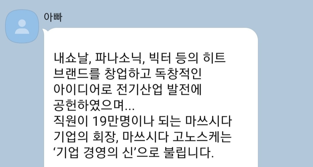 직원이 19만 명이나 되는 마쓰시다 기업의 회장, 마쓰시다 고노스케는 ‘기업 경영의 신’으로 불립니다.