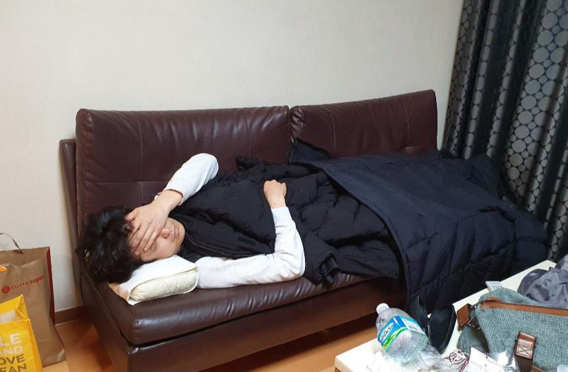 "나 너무 힘들었어. 오늘 시험하느라 하루 내내 서있었어. 나 몇 보 걸었는지 알아? 14000보... 진짜 너무 힘들어."