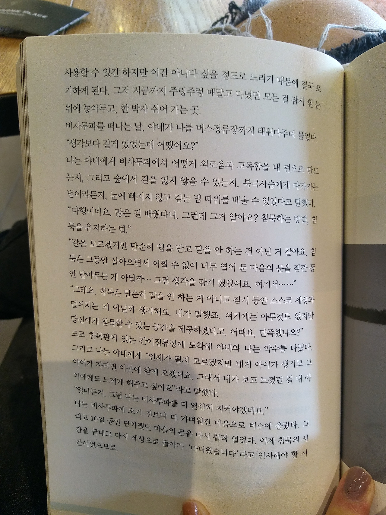 "잘은 모르겠지만 단순히 입을 닫고 말을 안하는건 아닌거 같아요. 침묵은 그동안 살아오면서 어쩔 수 없이 너무 열어 둔 마음의 문을 잠깐 동안 닫아두는 게 아닐까... 그런생각을 잠시 했었어요.여기서"