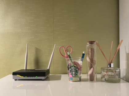 가위, 포스트잇, 펜을 넣어둔 수납통 하나와 칫솔, 치간칫솔을 꽂아두는 욕실용 수납통이 하나 있다. 그리고 두 수납통은 모두 스타벅스 아이스음료 테이크 아웃 잔이다.