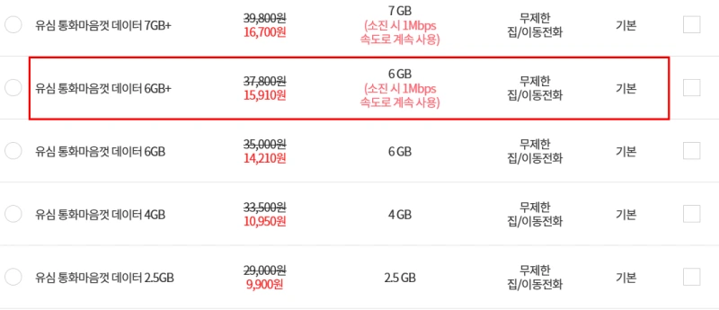 알뜰폰 요금제의 종류를 조회했다. 이미 사용하던 2.5기가 용량은 9,900원짜리 요금제를 통해 사용할 수 있었다. 하지만 매월 데이터가 부족했기에 6기가 플러스 요금제를 신청했다. 20일까지도 2.5기가로 잘 버텨 왔기 때문에 6기가 정도면 충분하다.