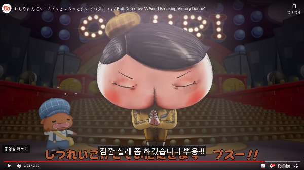 뿡뿡이의 은퇴로 아쉬워하던 아이들을 달래듯 그 뒤로 일본 동화 원작의 애니메이션'엉덩이 탐정'이 아이들의 귀와 웃음을 사로잡았다. 필살기인 '잠시 실례합니다' 방귀 한 방이면 사건은 역시 해결된다. 만능 방귀! 이렇게 방귀 소리는 '웃음소리'의 트리거(방아쇠)로 늘 한 세트를 이루고 있다. 왜일까? 냄새가 아니라 소리여서 그런 것!