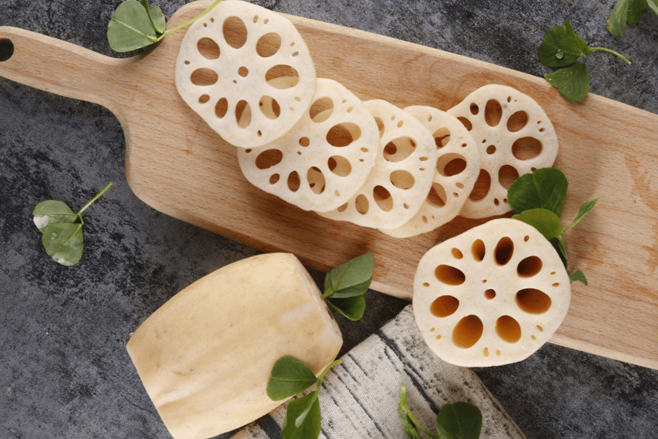 삼삼한 연근을 흰 쌀밥 위에 올려