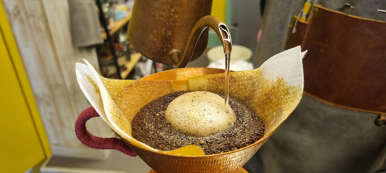 분화구를 만든 커피그렇게 내려진 커피가루는 분화구를 만들었고 내려진 커피 맛은 입안에서 꽃을 피우듯 촤악- 하고 퍼졌습니다.