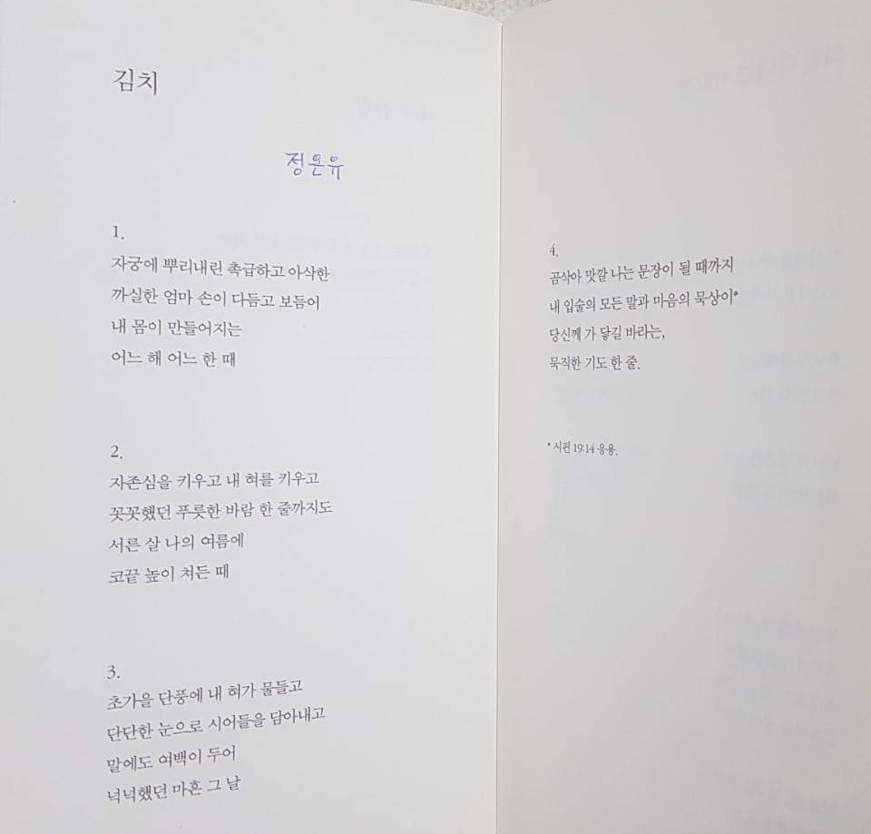나는 하늘이 무너지고 땅이 꺼진다는 말을 그때 처음 실감했다. 쓰디쓰고 찝찔하고 이건 김치 맛이 아니었다. 세상 어디서도 먹어보지 못한 이상한 맛이 그렇게 정성을 쏟아 만든 백김치에서 나는 것이었다. 나는 너무너무 속상해서 눈물이 났다. 배추도 배추지만 그 안에 들어간 재료값이 얼마며 내 정성은 또 어디서 보상을 받을 것이며, 이 많은 김치를 어디다 어떻게 버린단 말인가! 하여 속이 상할 대로 상해 잠도 못 잤다. 그 항아리를 들여다보는 게 겁이 날 정도였다. 안절부절못하며 세상 걱정근심은 혼자 다 갖고 있는 것 같은 얼굴을 하는 내게 동네 어른 한 분이 오셔서 무슨 큰일이 있기에 얼굴이 그렇게 상했냐고 물었다. 나는 울먹거리며 사정을 말 하니 그 어른이 어디 한 번 보자시며 그 항아리로 갔다. 나는 그 어른이 항아리에서 김치 줄기 하나를 떼어 내어 입으로 가져가는 그 모습을 지켜보면서 마치 무슨 중대한 결정을 기다리는 사람처럼 내 온몸 근육과 신경 줄이 내 눈동자로 죄다 쏠리는 것 같은 느낌이었다.