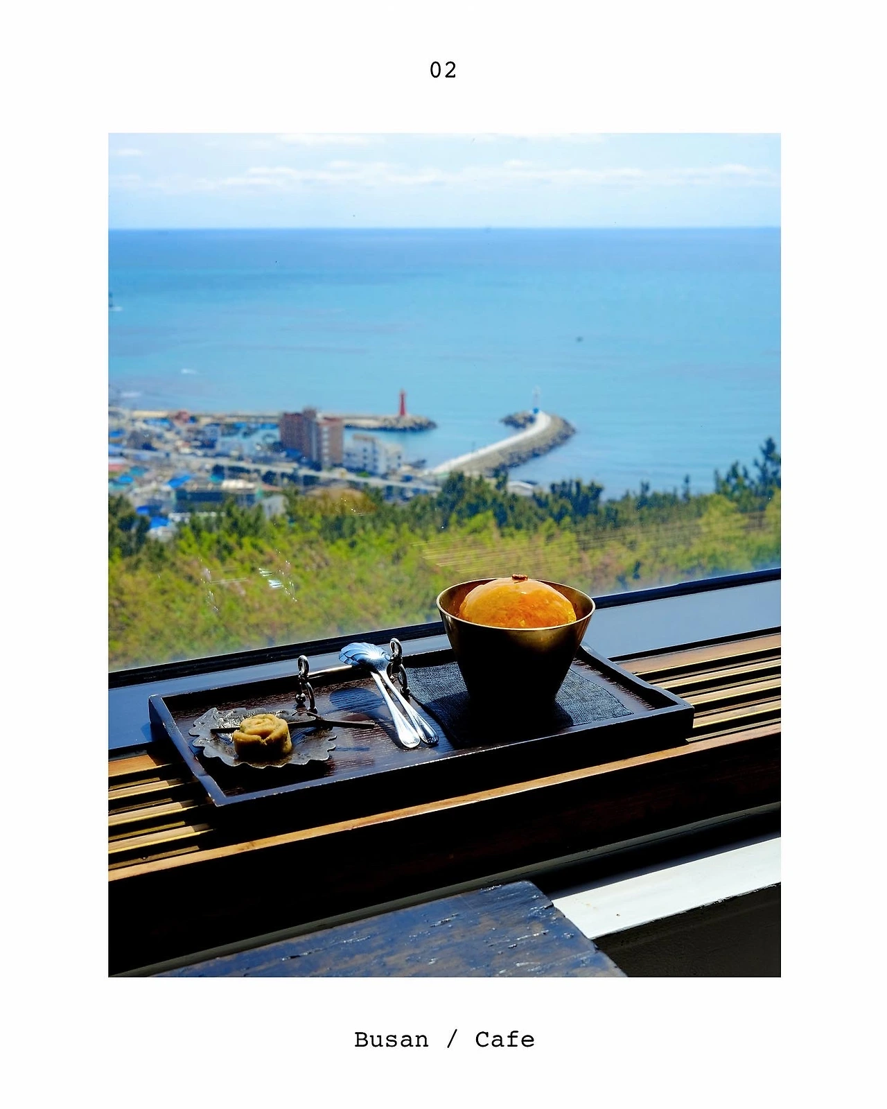 카페임에도 불구하고 코스 메뉴까지 준비되어 있는 이 고급 전통 카페에서는 청사포를 바라보며 다양한 차와 전통 디저트를 여유롭게 즐길 수 있다. 맛은 물론이고 음료 한잔을 주문했음에도 작은 입가심 메뉴까지 함께 곁들여진 한상 차림을 보면, 모든 부분에 정성을 들인 주인의 마음을 피부로 느낄 수 있다. 특히 나뭇잎 트레이 위에 올려진 장미 모양의 전통 디저트와 나뭇가지 포크도 빼놓을 수 없는 비비비당의 섬세함이었다.