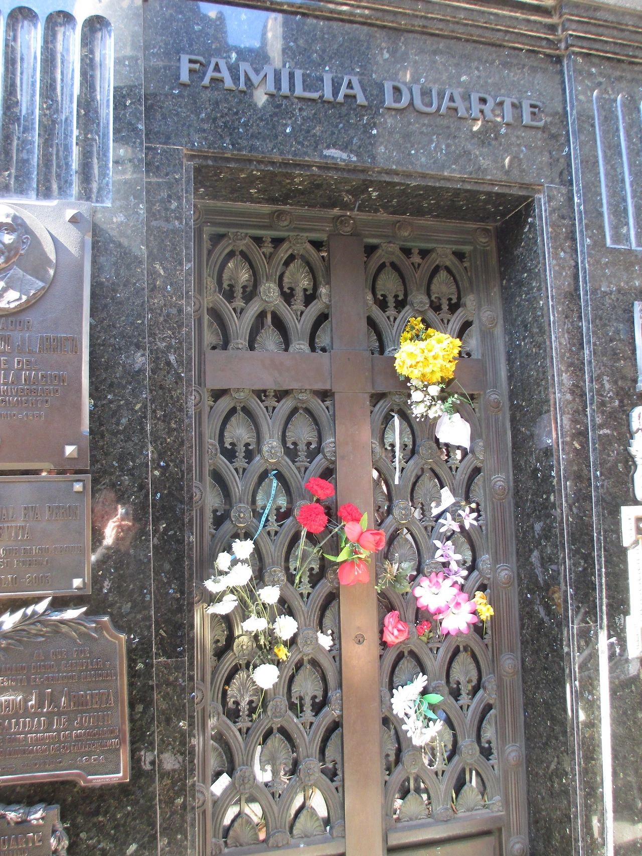 우뚝 솟아있는 검은 대리석 묘지가 십자가 문양이 그려져 있는 철문으로 굳건히 닫혀 있다. 마치 고급 저택의 대문 앞에 선 듯 위압감이 느껴졌다. 대부분의 묘지가 흰색 혹은 회색이기 때문에 더욱 눈에 띄었다. 그리고 철문 사이사이에는 누군가 두고 떠난 지 얼마 안 되어 보이는 생기 넘치는 여러 송이의 꽃들로 에비타의 묘지임을 확신할 수 있었다.