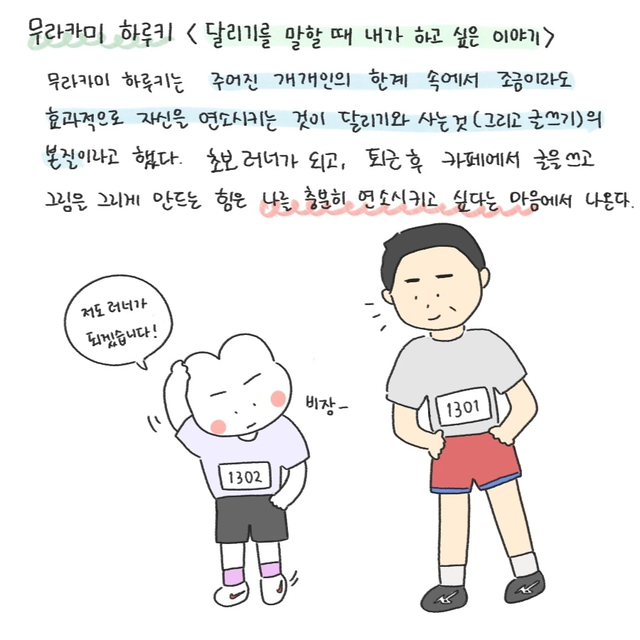 <그러나 그녀들의 달리는 모습을 보고 있는 것은 그 나름대로 멋있다. 이렇게 해서 세계는 확실하게 이어져가는 것이로구나, 하고 소박하게 실감한다. 그것은 결국 인류 대대로 내려오는 전달 사항인 것이다. 그러므로 그녀들에게 뒤에서부터 추월을 당해도 별로 분하다는 기분이 들지 않는다. 그녀들에게는 그녀들에게 어울리는 페이스가 있고 시간성이 있다. 나에게는 나에게 적합한 페이스가 있고 시간성이 있다. 그것들은 전혀 다른 성질의 것이며, 차이가 나는 건 당연한 것이다.>