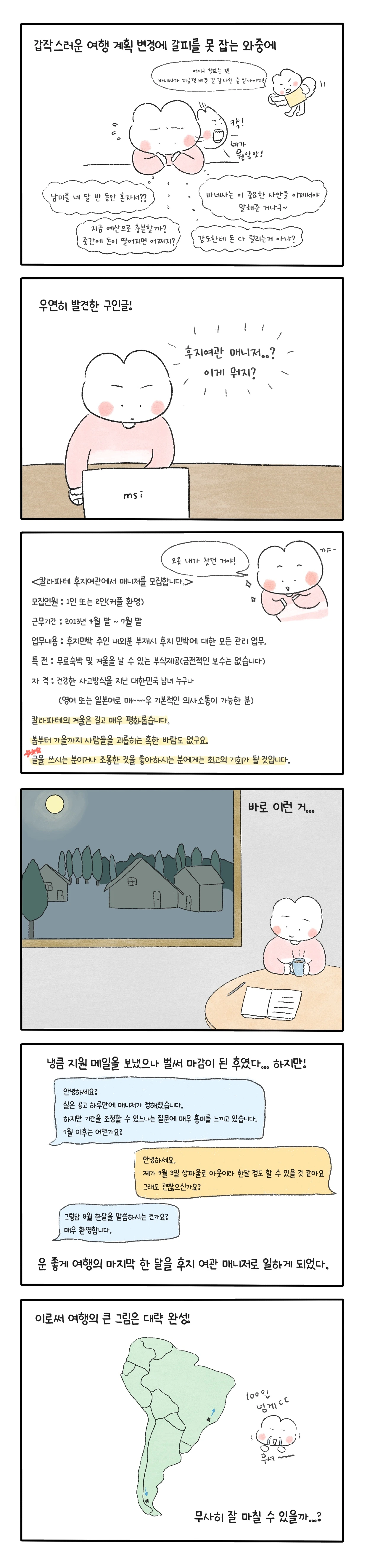 남미 여행 카페에서 여행 후기를 살펴보던 중 우연히 한 구인 글을 발견했다. 아르헨티나 칼라파테에 있는 후지 여관에서 일할 매니저를 찾는 글이었다. 글을 천천히 읽어보니 너무나도 내 마음에 쏙 드는 조건이었다. 냉큼 맨 아래 적혀있는 메일 주소로 지원 메일을 보냈다. 얼마 안 되어 사장님으로부터 답장이 왔고, 일하는 기간에 대한 조정이 있긴 했지만 여행 마지막 달인 8월 한 달을 후지 여관 매니저로 일하는 것이 확정되었다.