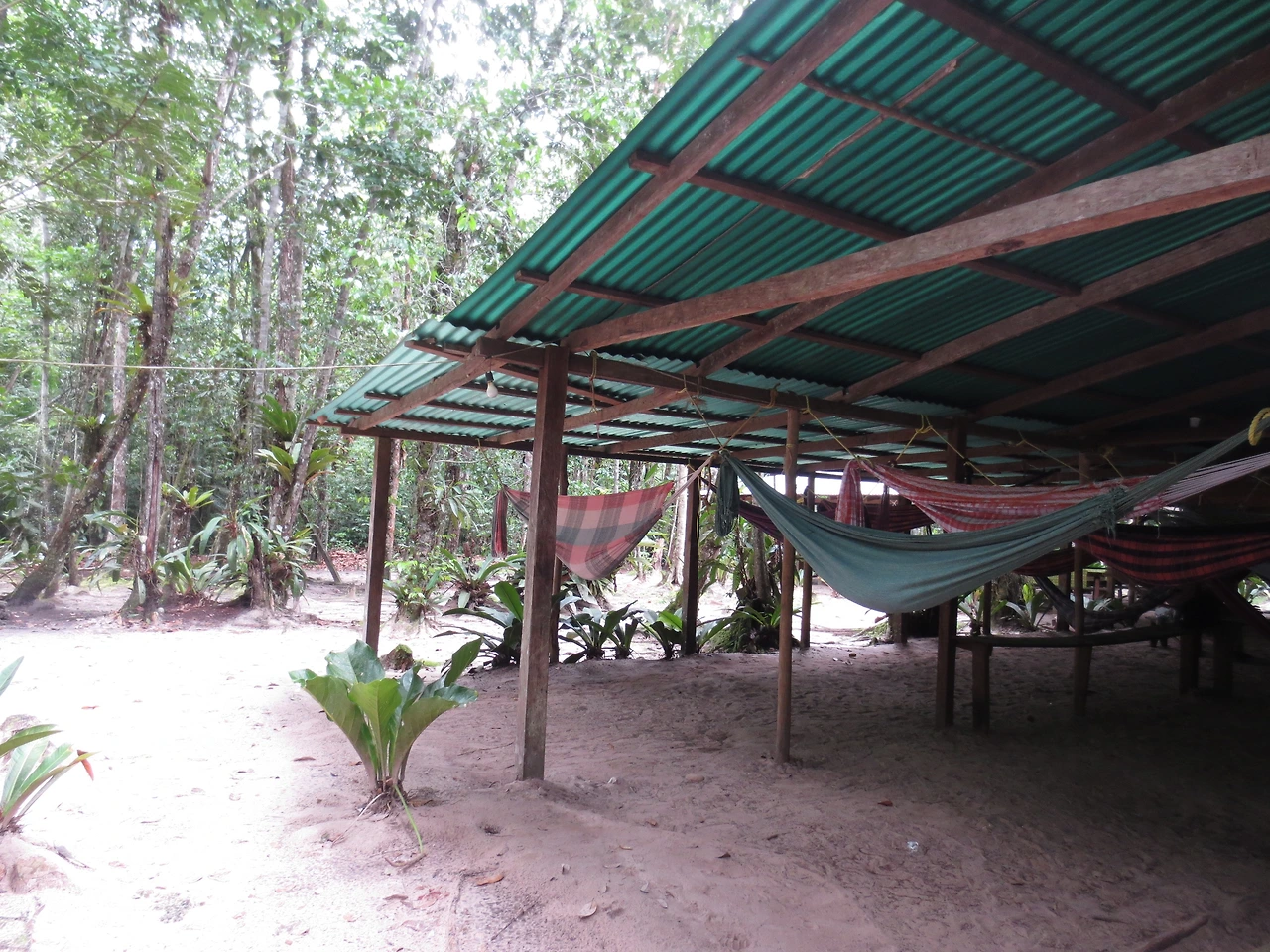 도착한 캠핑장은 강 건너 엔젤폭포가 잘 보이는 위치에 자리 잡고 있었다. 나무로 된 기둥이 몇 개 세워져 있고 판자가 한 겹 얹어져 지붕 역할을 했는데 비를 버틸 수 있을지 의문이었다. 출발할 때의 맑은 하늘은 사라지고 먹구름이 끼기 시작하는 하늘을 바라보니 더욱 걱정되었다. 다른 가림막도 없이 해먹이 여러 개 대롱대롱 걸려있어 얼핏 수용소 같다는 느낌이 들었다. 하지만 처음 누어보는 해먹이 생각보다 편하고 아늑했다. 무엇보다 이리저리 움직이는 게 재미있었다.