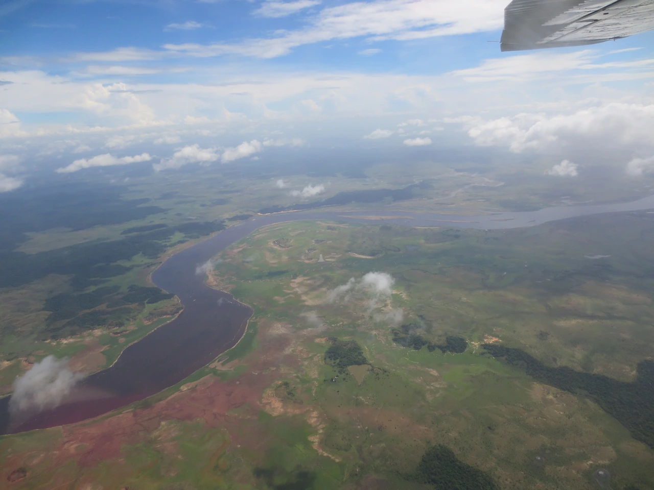 발아래 거대한 카나이마 국립공원이 펼쳐져 장관을 이루었다. 마치 미지의 땅을 발견한 모험가가 된 기분이었다. 위성으로 지상의 모든 곳을 속속들이 들여다볼 수 있는 이 시대에서는 더 이상 이런 기분을 실제로 느낄 수 없게되어 안타깝다. 그란 사바나의 넓은 초원 사이로 가지처럼 뻗어져 있는 작은 강들이 커다란 강으로 모여든다. 붉은빛 강물이 생명력 넘치게 흐르고 있다.