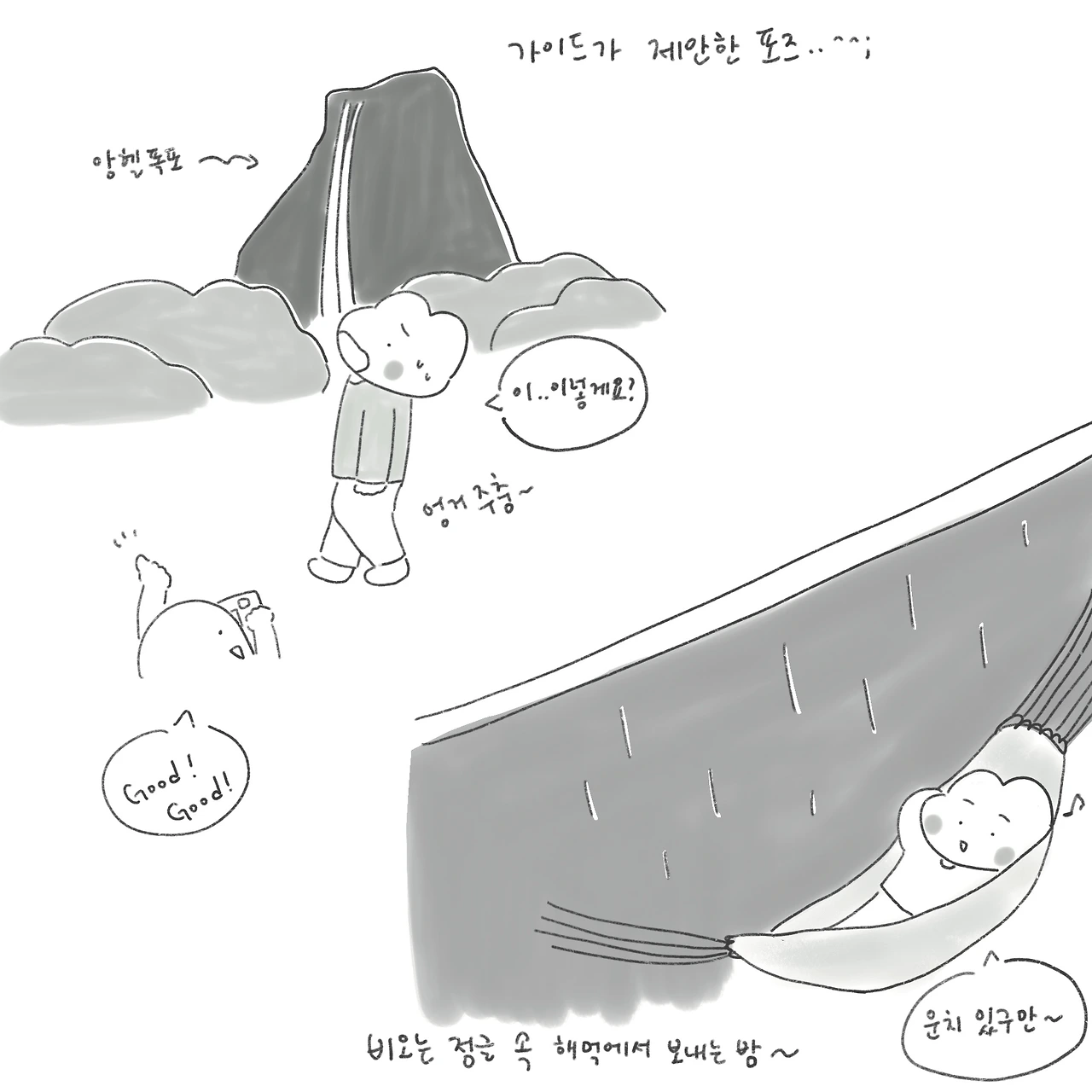 가까이에서 본 엔젤폭포는 목을 한껏 꺾어 올려다봐야 할 정도로 솟아있다. 안개인지 폭포의 포말인지 모를 하얀 연기가 그 높이를 따라잡으려는 지 하늘로 높이 날아오른다. 엔젤 폭포 아래에서 우리는 비에 쫄딱 젖어 눈도 제대로 못 뜨고 있지만 물이 넘쳐흐르는 폭포수를 배경으로 비장하게 사진을 찍었다. 우리는 또 한 번 새로운 곳에 발을 딛게 된 서로를 격려해주었다. 비가 많이 와 오래 머무르지는 못하고 바로 돌아와야 해서 아쉬웠다. 날이 좋았다면 이곳에 널브러져 폭포가 떨어지는 걸 하염없이 바라봤을 텐데.