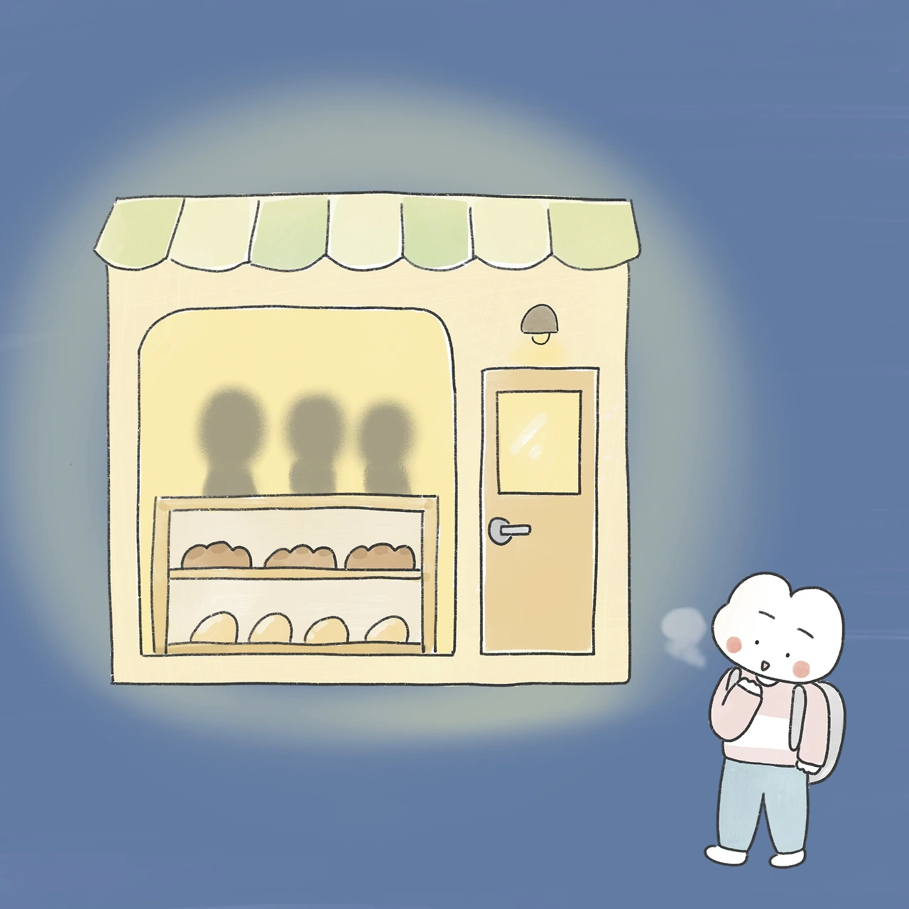 그 순간 어두운 통로 속 저 끝에서 따스한 노란 불빛이 새어 나왔다. 다가가 보니 작은 매점이었는데 유리 뒤편 가판대에 반들반들 맛있어 보이는 빵들이 진열되어 있었고 사람들이 이야기를 나누는 정겨운 소리가 문틈 사이로 새어 나왔다.