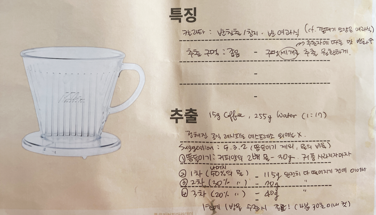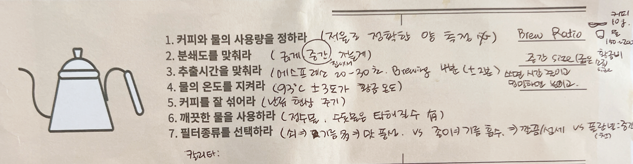집 앞에 (또) 새로 생긴 커피숍을 우연히 한번 방문했는데, 바로 다음날 커피 원데이 클래스를 한다 하여 신청해 보았다. 솔직히 바리스타 맛보기 클래스도 아니고, "브루잉 커피만 장장 두 시간이나 들여 별도 클래스 할 내용이 있을까?"하며 나이브한 호기심 반, 기대감 반으로 참여를 하게 되었다. 나는 뭐든지 배우는 것을 좋아하니까. 커피도 좀 더 알고 마시면 왠지 더 맛있을지도 모른다는 생각도 했다. 그런데 나의 그 애초 의문이 얼마나 무식한 생각이었는지를 깨닫는 데에는 채 10분도 걸리지 않았다. '그냥 어떤 커피에 물을 끓여서 필터로 한번 내리는 것'이 브루잉이 아니었다. '어떤 원두를 어떤 굵기로 갈아서, 정확히 몇 도로 맞춘 정수 물을 가지고 커피와의 농도 황금 비율을 정하여, 몇 번에 물을 얼만큼씩 나누어서 몇 분 만에 내리는지'가 바로 브루잉이었다. 김치처럼 직접 버무리는 손맛이 베일 리가 없는 공정인데도, 같은 재료와 수치들로 내리는데도 희한하게 사람에 따라 맛이 달랐다.
