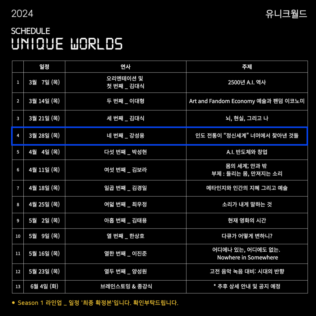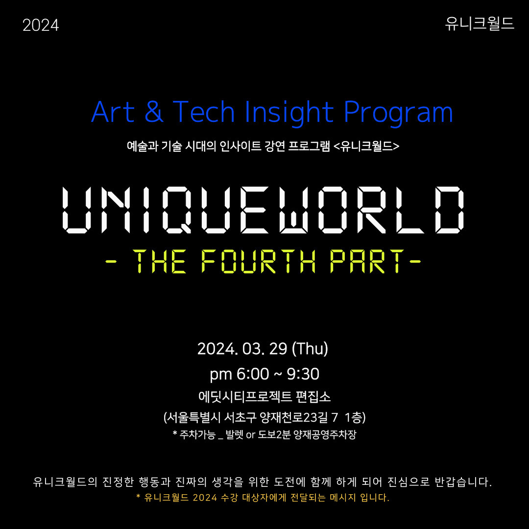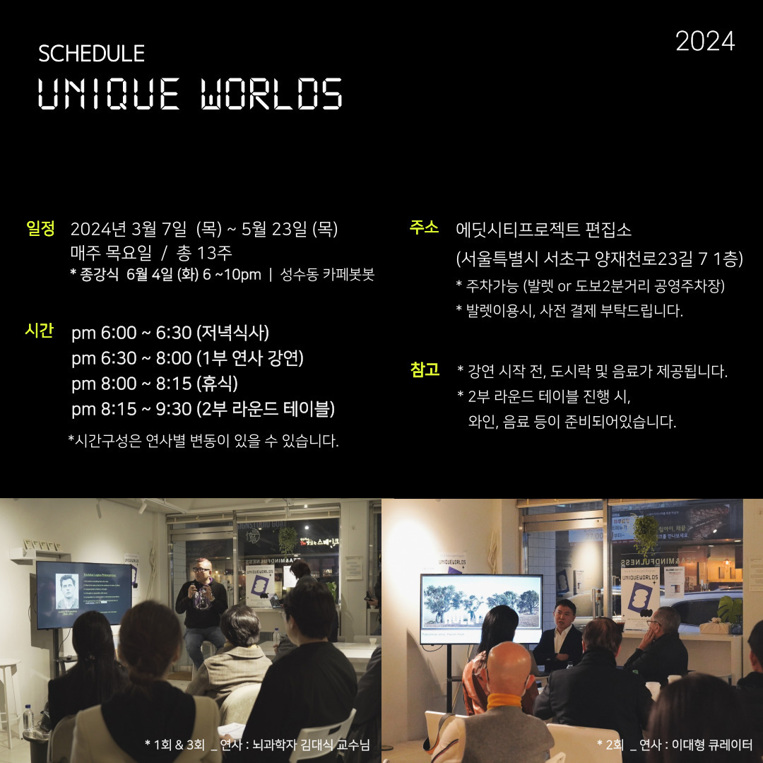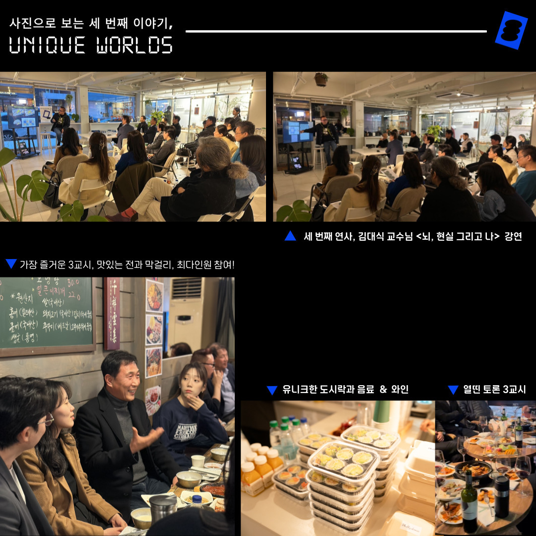 한 회차의 강연만으로 다 알 수 없는 미지의 물음표들이 떠돌아다닙니다. 앞으로 남아있는 유니크월드의 강연들을 통해 그 물음표에 확신을 더하며 각자만의 고유한 퍼즐을 완성해볼 수 있을 것입니다.