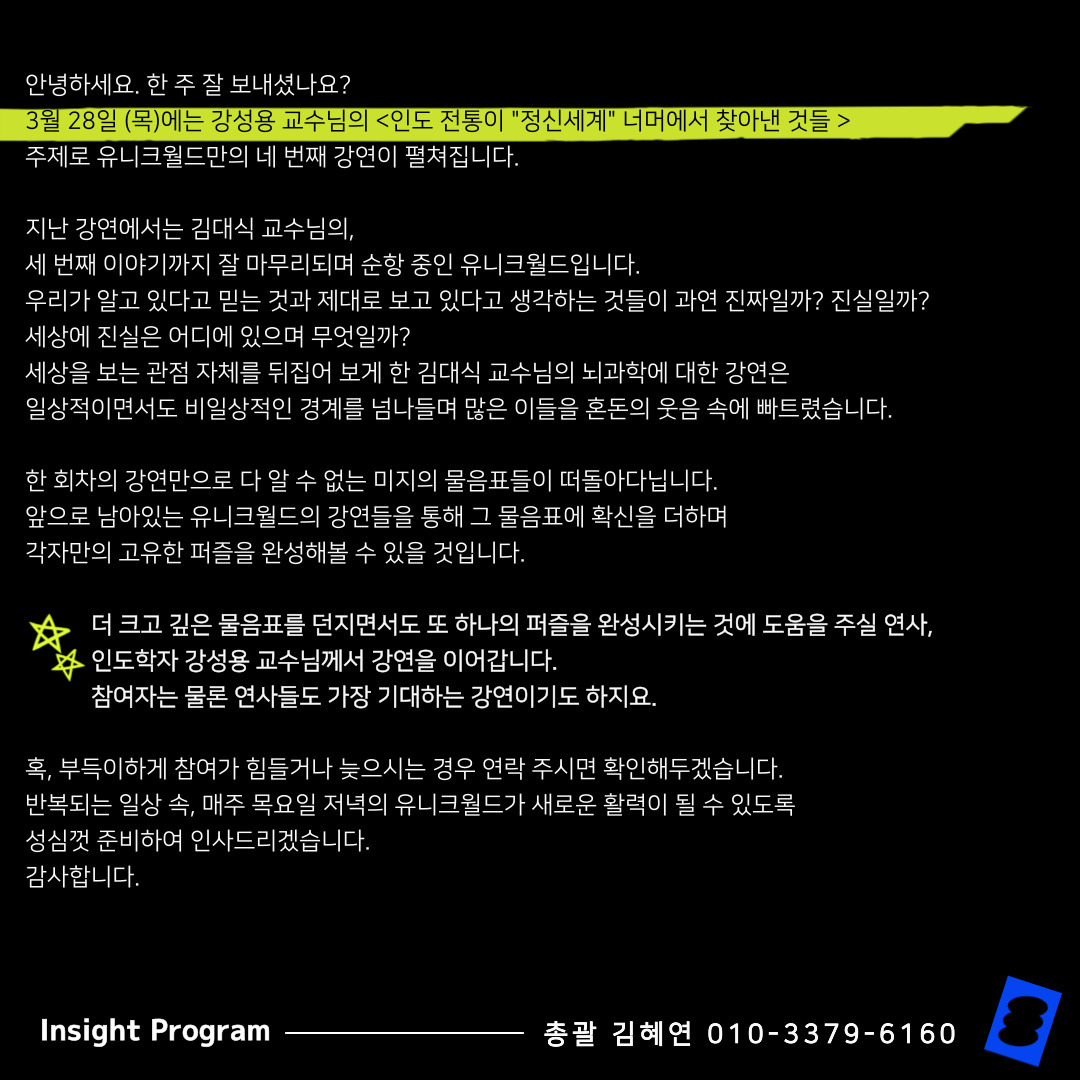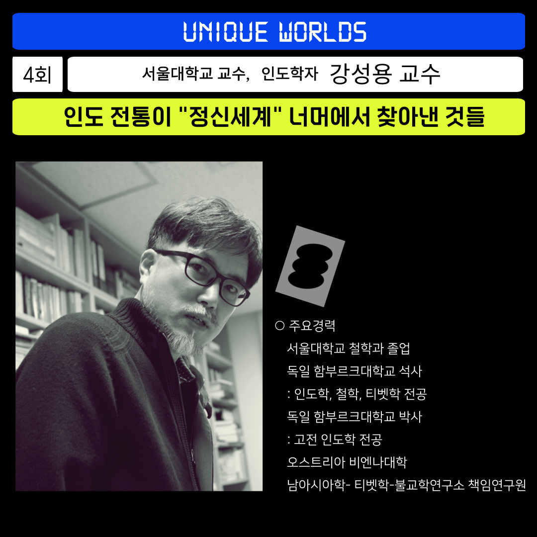 안녕하세요. 한 주 잘 보내셨나요? 3월 28일 (목)에는 강성용 교수님의 <인도 전통이 "정신세계" 너머에서 찾아낸 것들> 주제로 유니크월드만의 네 번째 강연이 펼쳐집니다.