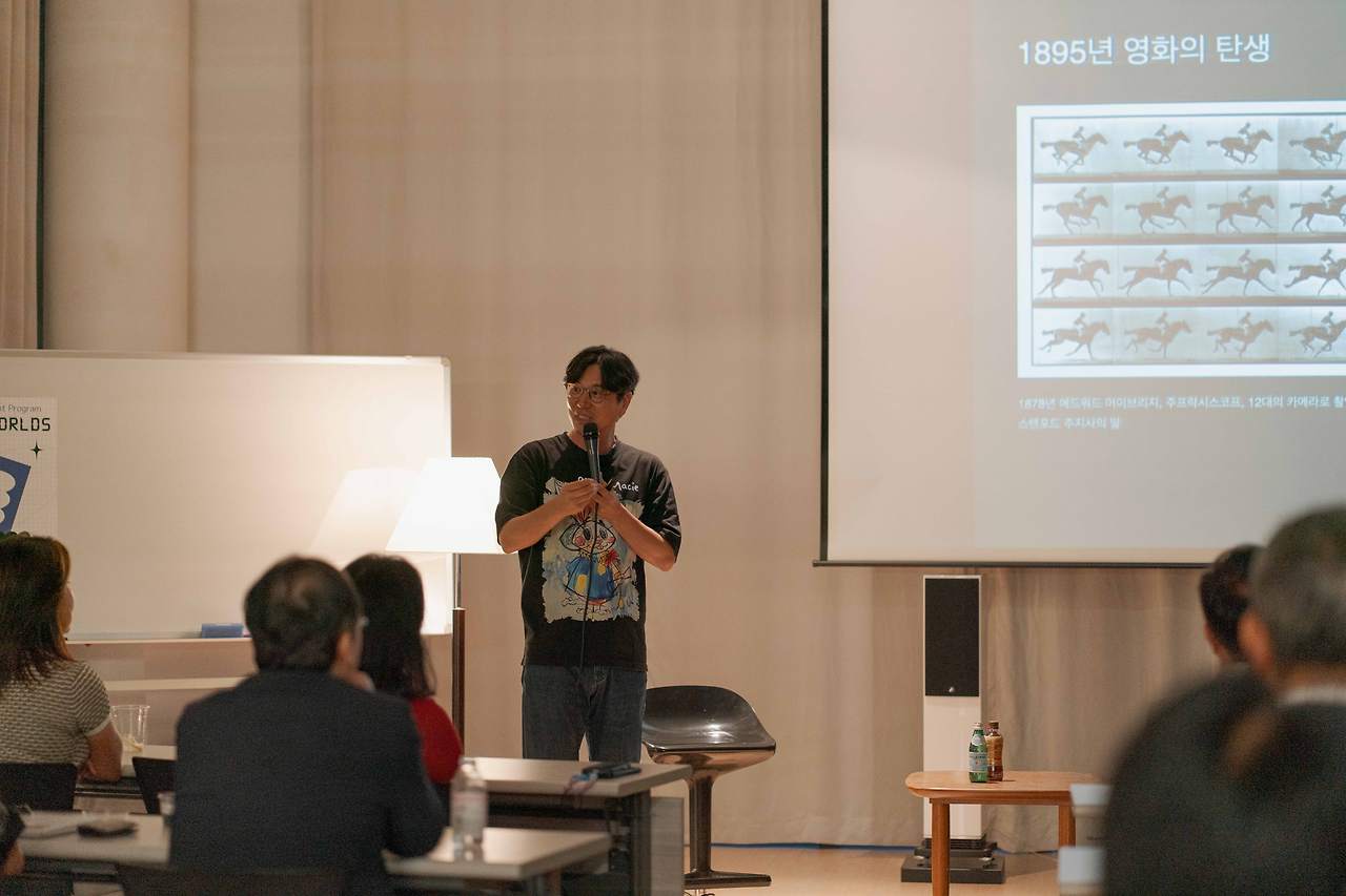김태용 감독님의 강연에서는 말의 네 발이 모두 떠있는 그림 사진으로 인한 내기로 12명이 동시 촬영하게 되었고, 그것을 연결한 것이 영화의 시작이었다는 이야기를 들려주셨는데요. 과거 영화라는 것은 공간과 사람과의 상호 작용에 따른 형태가 영화라는 것을 정의하는 데에 영향을 미쳤다는 것을 알 수있었어요. 이후 현재 AI의 기술이 가속화의 발전 속에서 영화계에 어떤 영향을 미치고 있으며 감독님은 어떻게 이 시기를 바라보고 작업적으로 활용하고 있는지, 또는 어떤 마음과 생각으로 영화의 미래를 고민하고 계신지 개인적인 고민까지 들어볼 수있는 시간이었습니다.