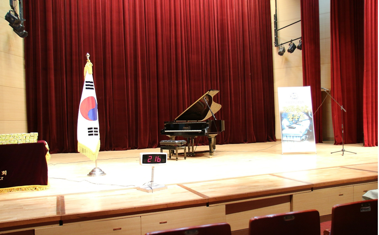 일반적인 피아노 무대. 나는 저 빨간 커튼 뒤로 무대 밖을 기어 나갔다.
